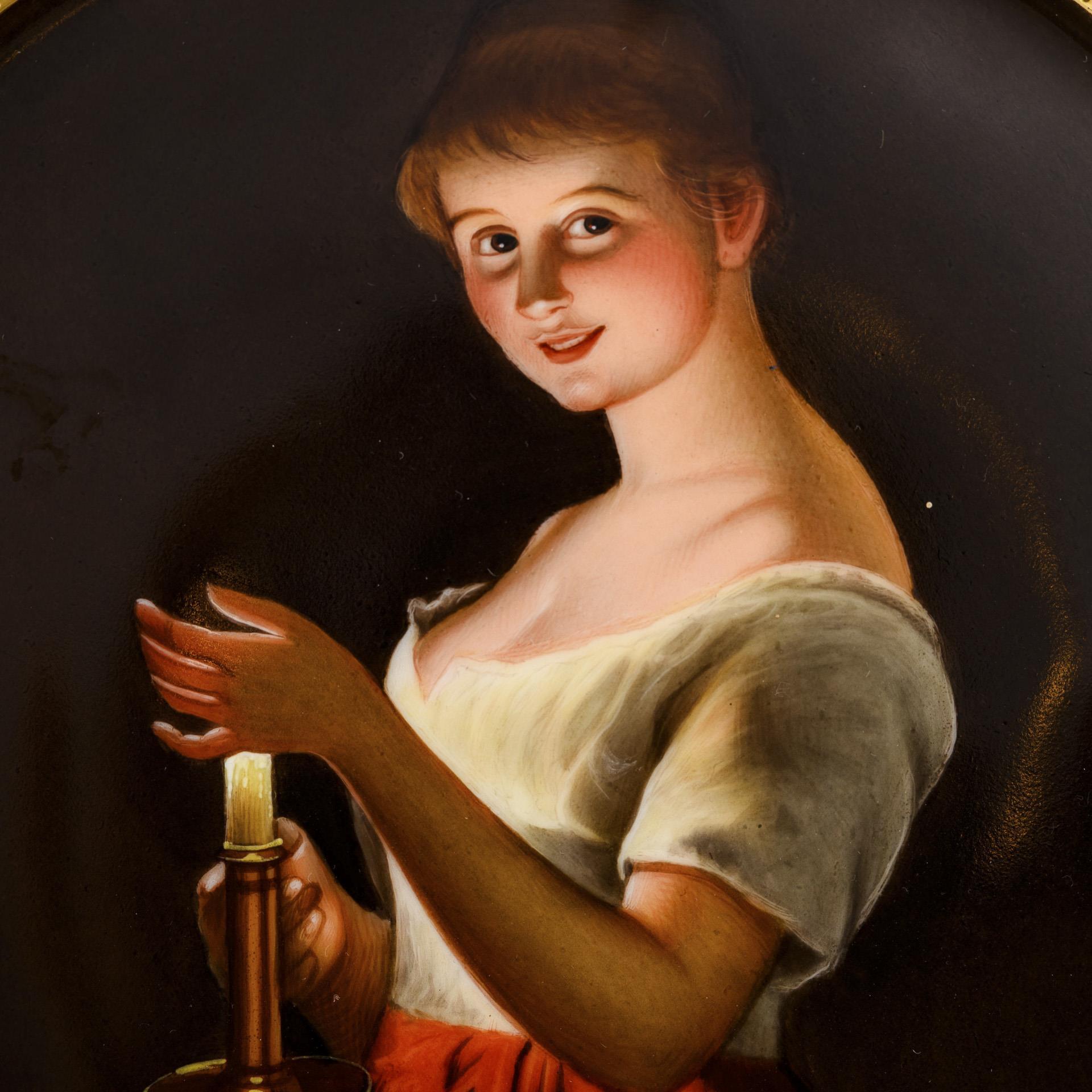 Im Spiegel die Darstellung einer jungen Frau mit Nachtlicht, nach einem Gemälde von Georg Hom (1838-1911), Fahne mit Kobaltfond und reicher Goldmalerei.