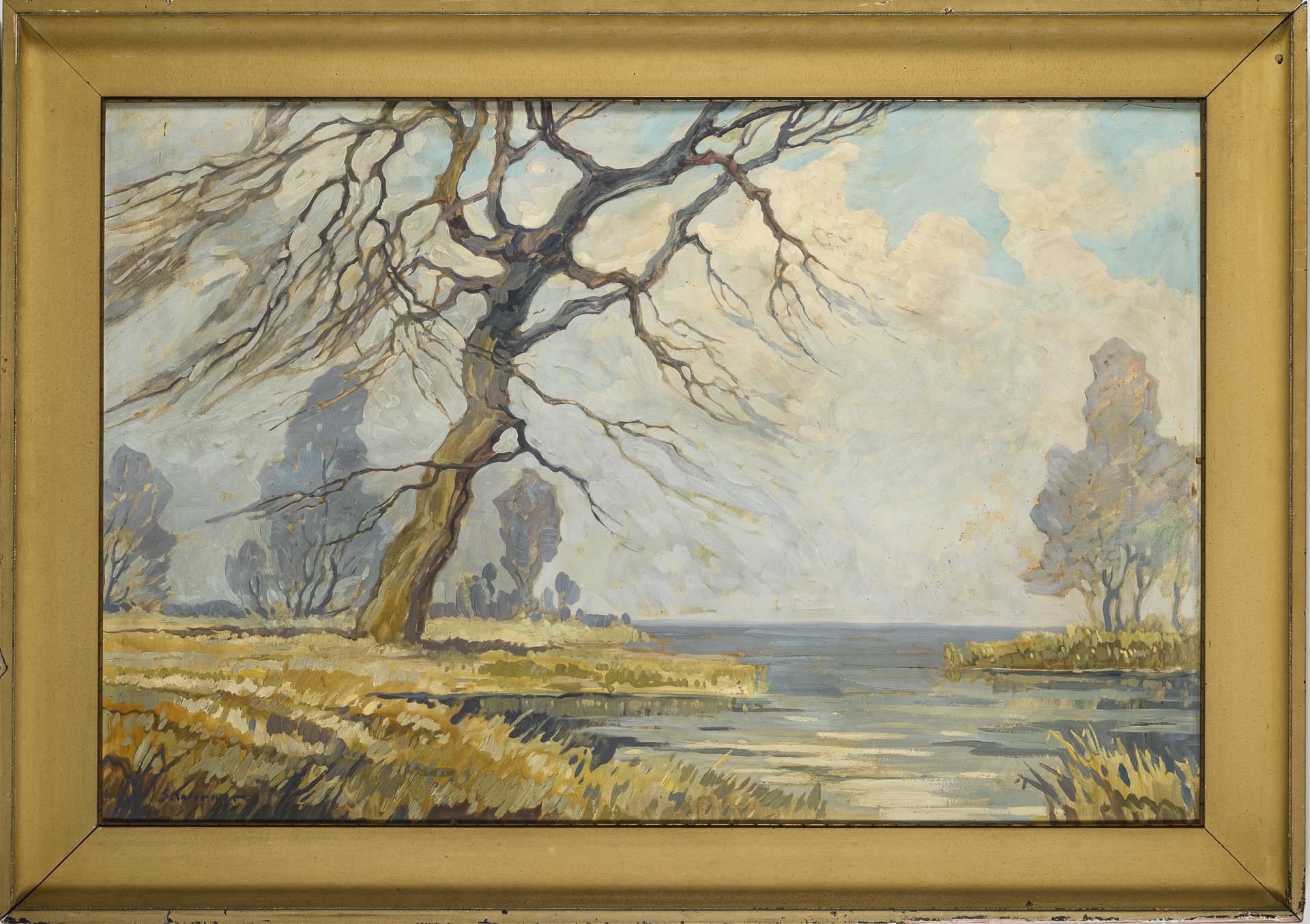 Weite flache Küstenlandschaft mit kahlen Bäumen auf gelbem Gras im hellen Sonnenschein. Anbei eine Vorzeichnung für den Rahmenhersteller.