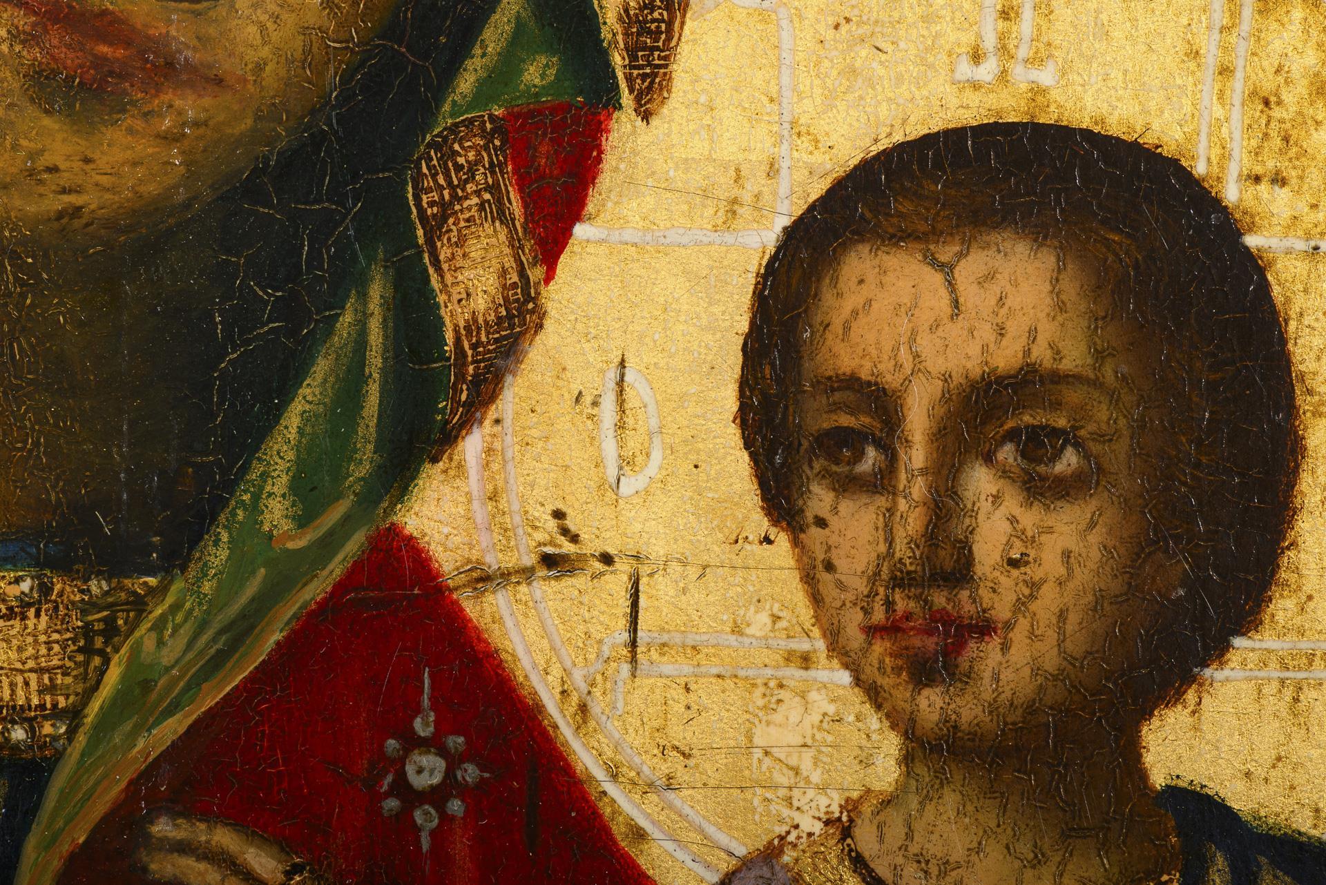 Die Muttergottes mit dem segnenden Jesuskind auf dem Arm vor goldenem Hintergrund. Altersspuren.
