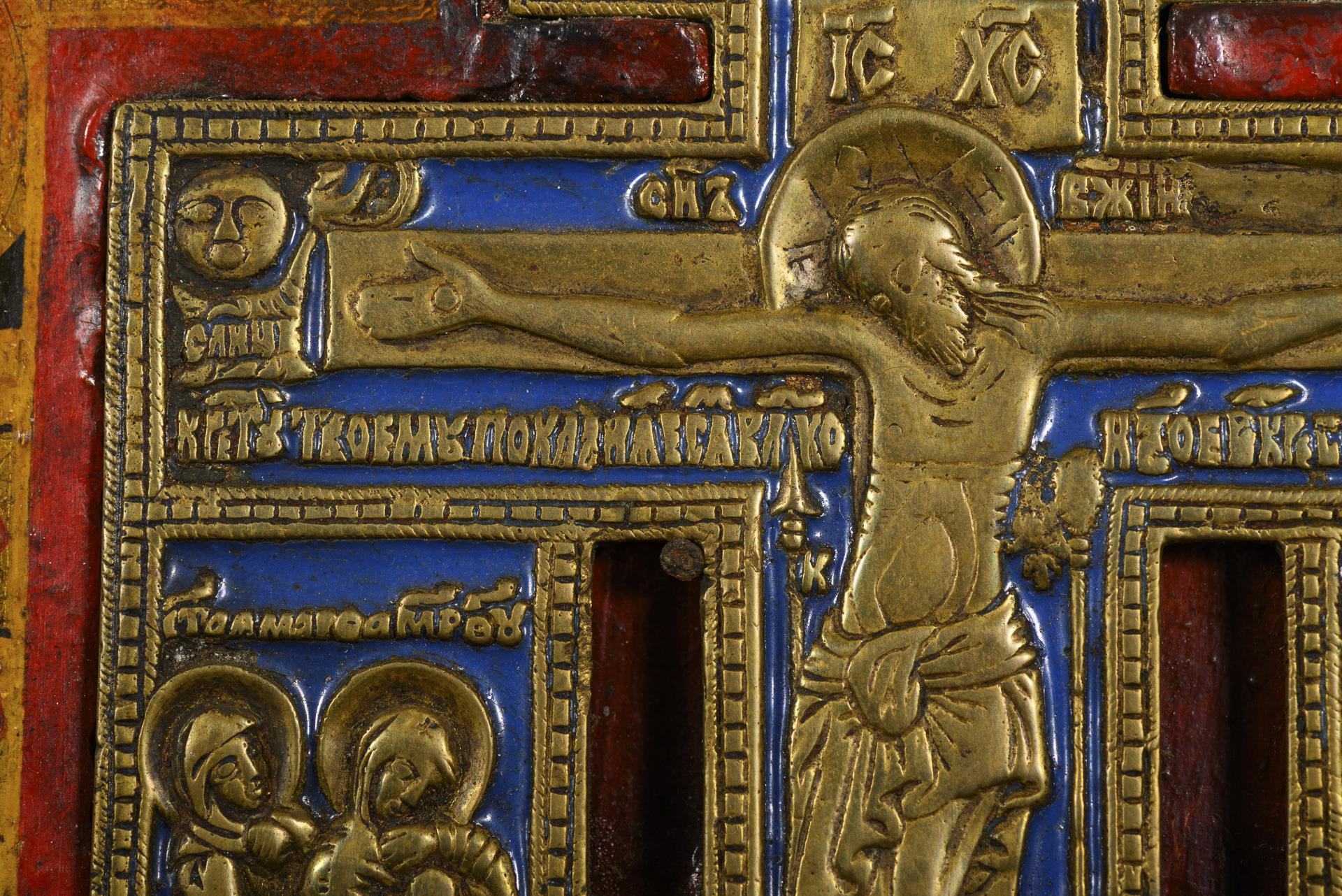 Metallikone mit Kreuzigungsszene im Zentrum umgeben von verschiedenen Heiligen und Szenen.
