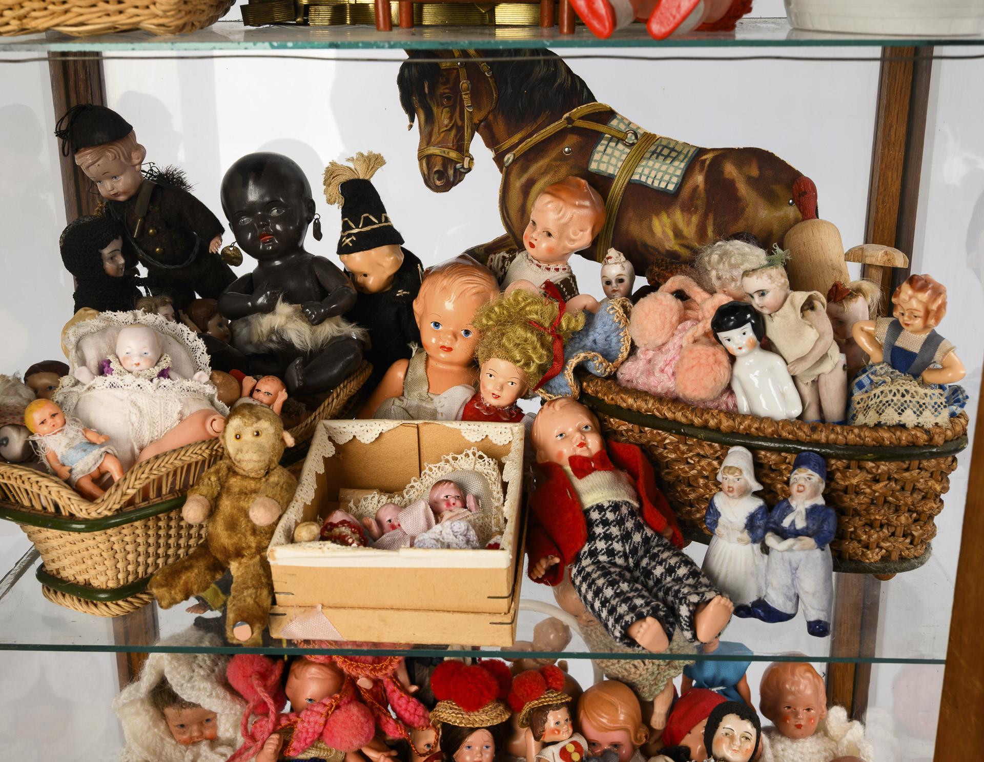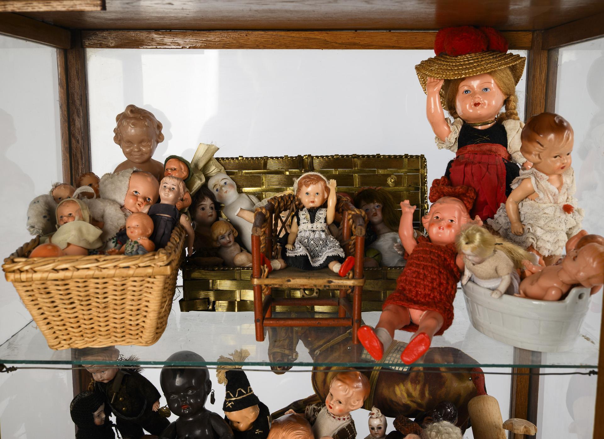 Jugendstil-Vitrine mit Puppen-Konvolut.
