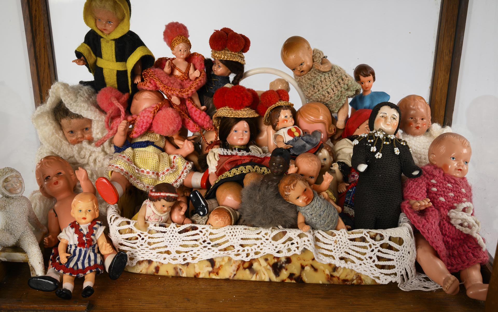 Verglastes Sammlungsschränkchen aus Eichenholz, mit zahlreichen Püppchen aus verschiedenen Zeiten und Materialien (L 3 - 20 cm). Verschiedene Erhaltungszustände, teils defekt.