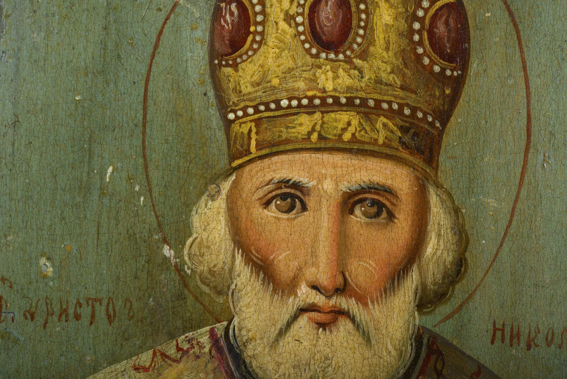 Jeweils Darstellung des orthodoxen Heiligen mit Heiliger Schrift und Segensgestus. Nagellöcher an den Rändern.