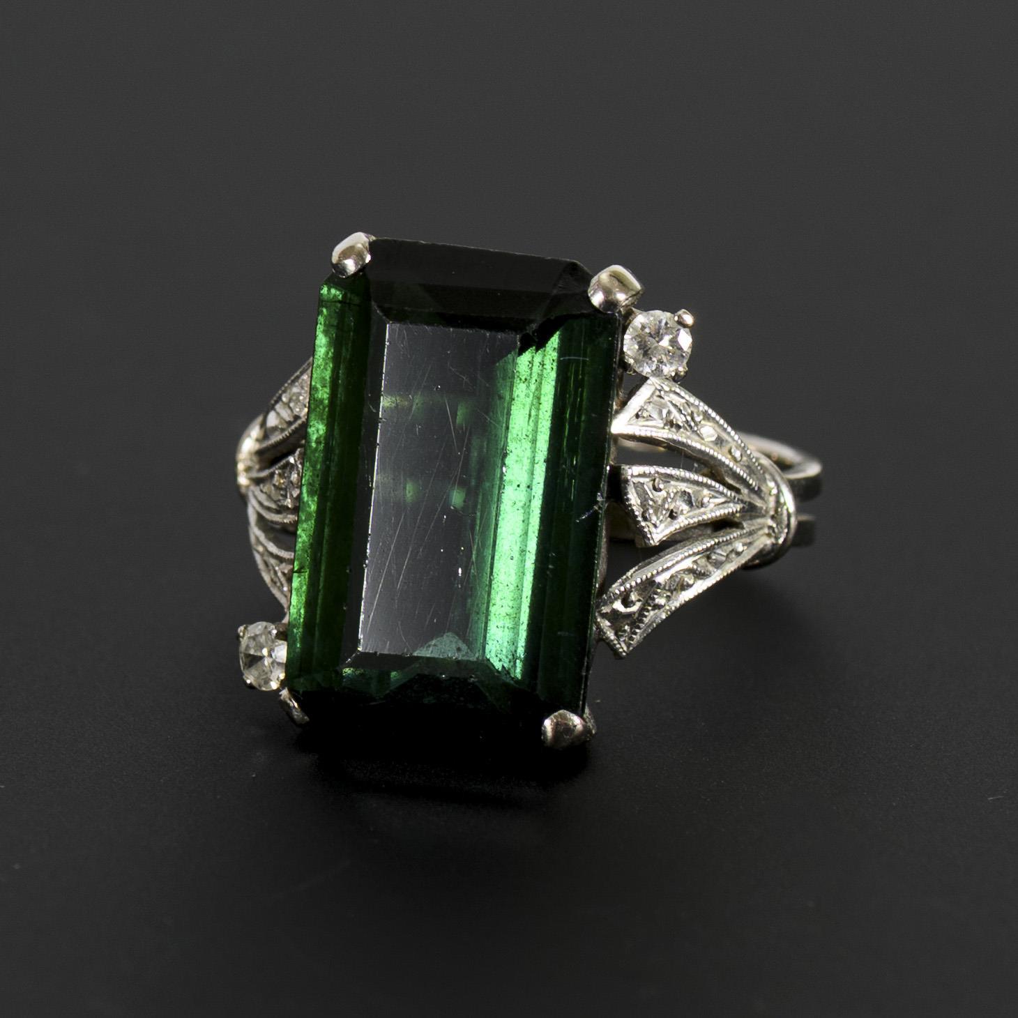 Ring mit grünem Farbstein, wohl Turmalin, im Smaragdschliff zwischen dreigliedrigen Ringschultern, an zwei Ecken je von einem Brillanten flankiert. Der grüne Farbstein mit Tragespuren, ein Chip an einer der Krappen (hält sicher in der Fassung).