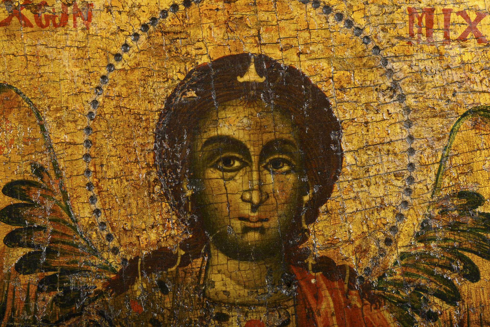 Der Erzengel mit dem Schwert vor goldenem Hintergrund. Altersspuren.