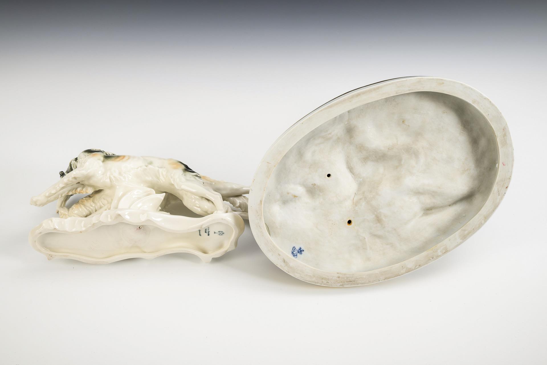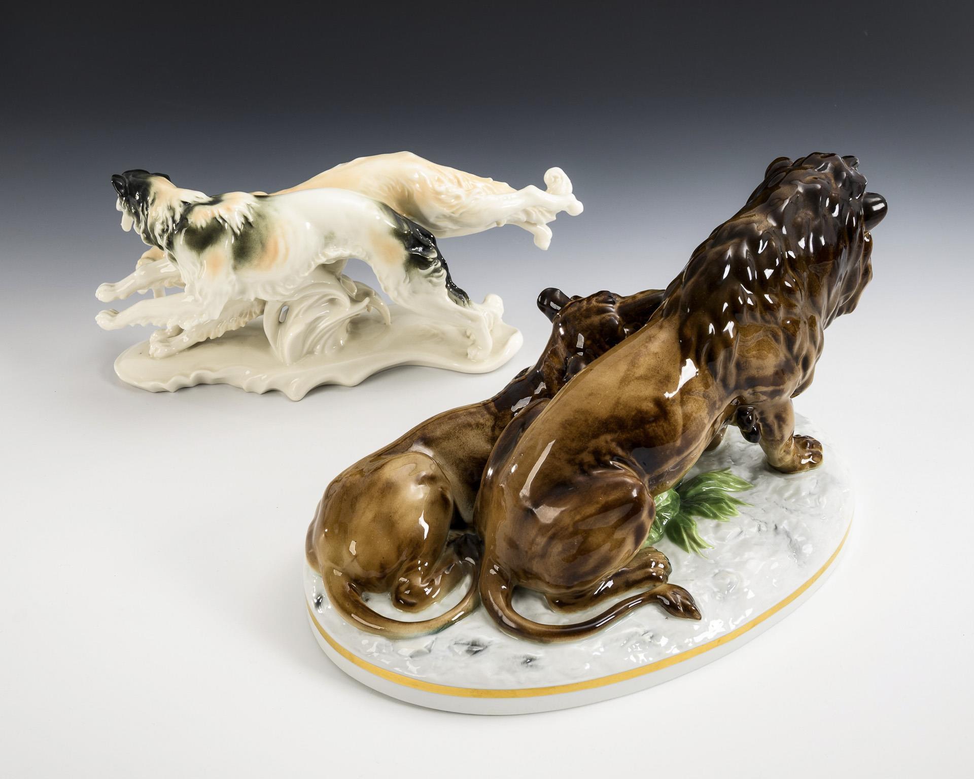 1x MÜLLER & CO., 1907-1949: Löwenpaar auf ovalem Natursockel (H 20,5 cm). / 1 ENS, 2. H. 20. Jh.: zwei über einen Natursockel springende Barsois (H 13,5 cm).