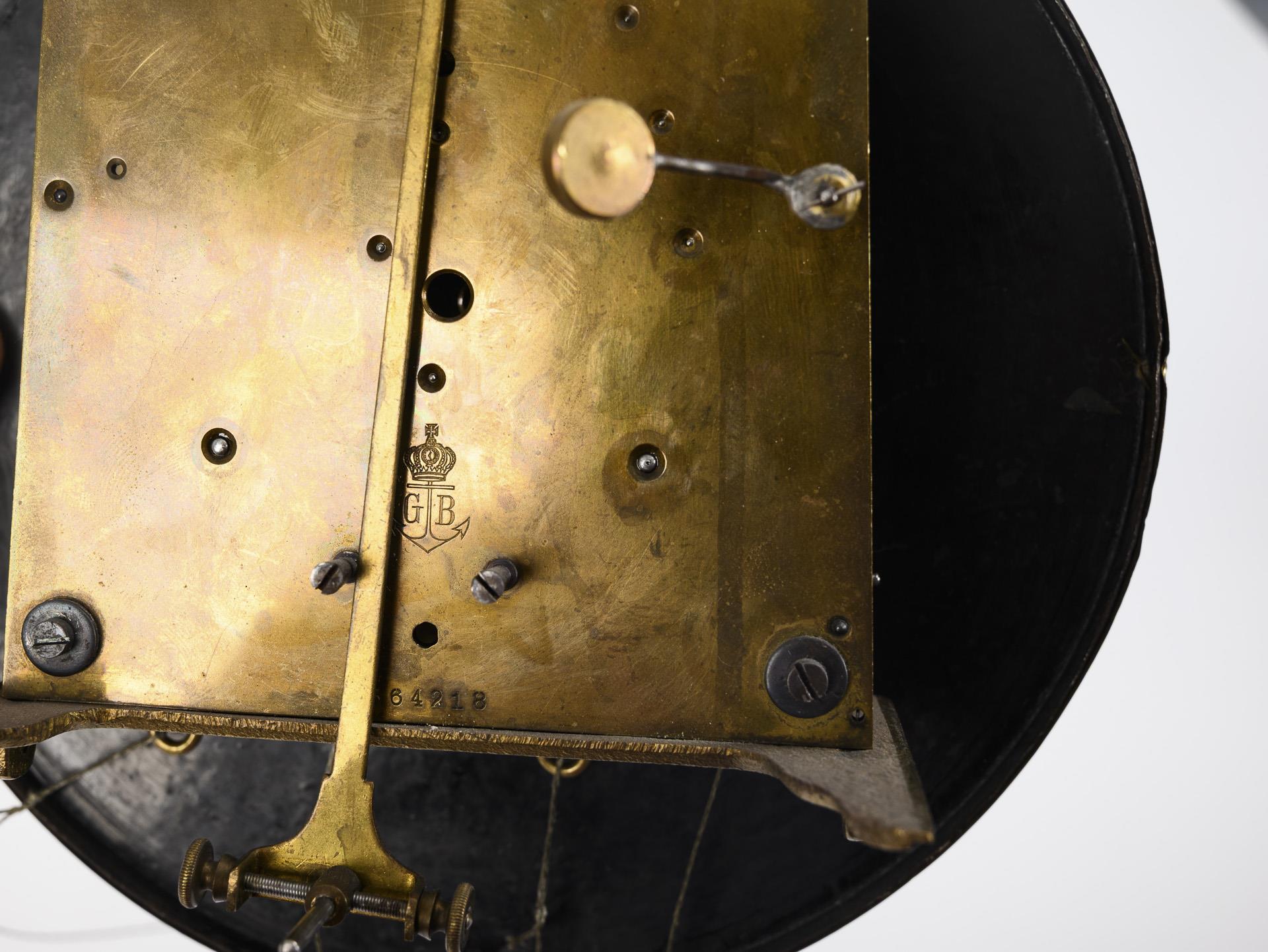 Gemarktes Werk mit Halbstundenschlag auf Tonfeder. Funktion nicht geprüft. "GB" gemarktes, weißes Emailziffernblatt mit vertiefter Blattmitte, römischen Zahlen, Minutenkranz, kleiner Sekunde und Messingzeigern.