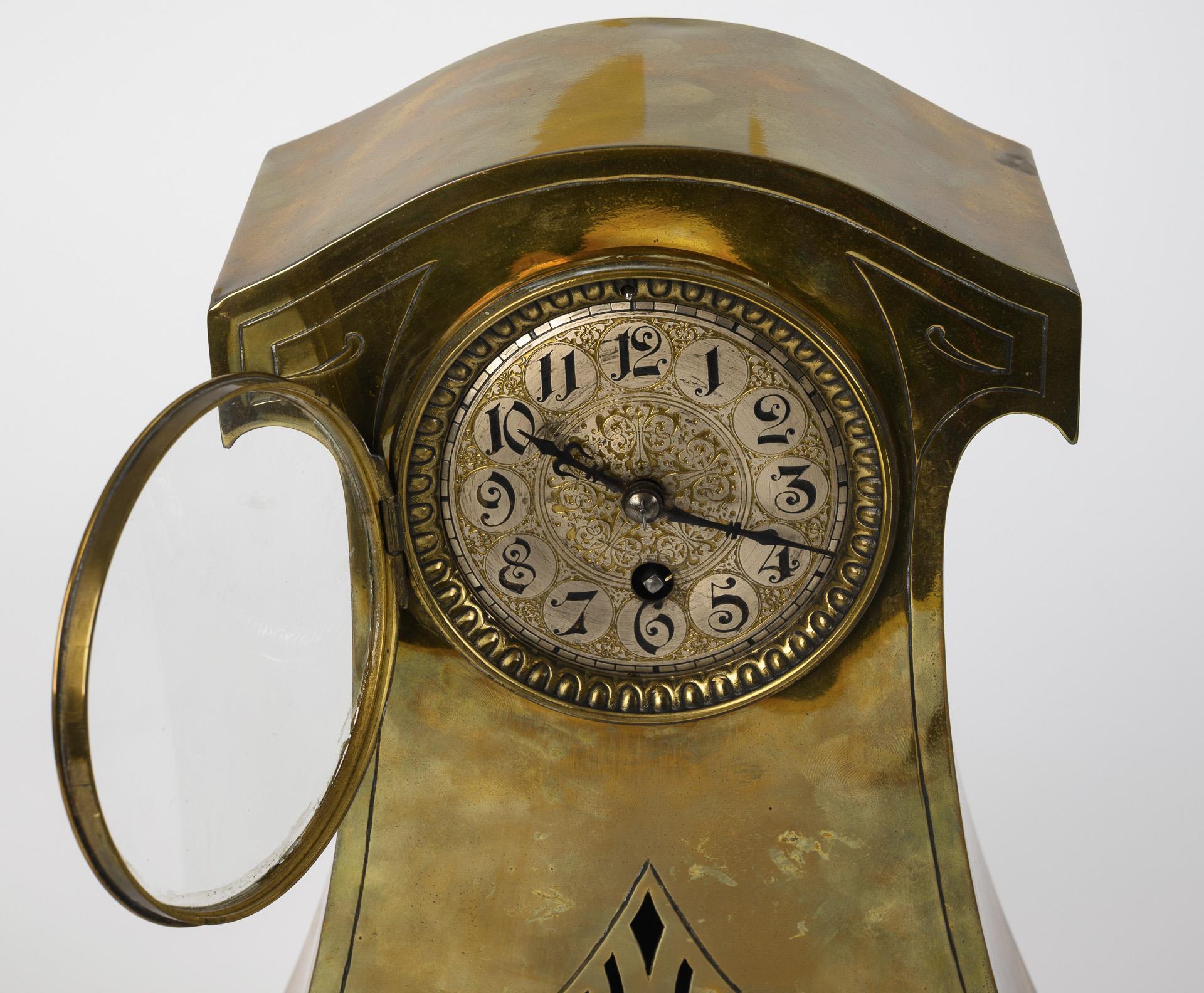 Elegante Jugendstil-Form mit leicht gerundetem Giebel über konisch ausgestelltem Korpus mit gebogtem Sockel, frontseitig konturierender Liniendekor und perforiertes Rautenmotiv. Leichte Altersspuren, Versilberung berieben, Gehäuse partiell gedellt.