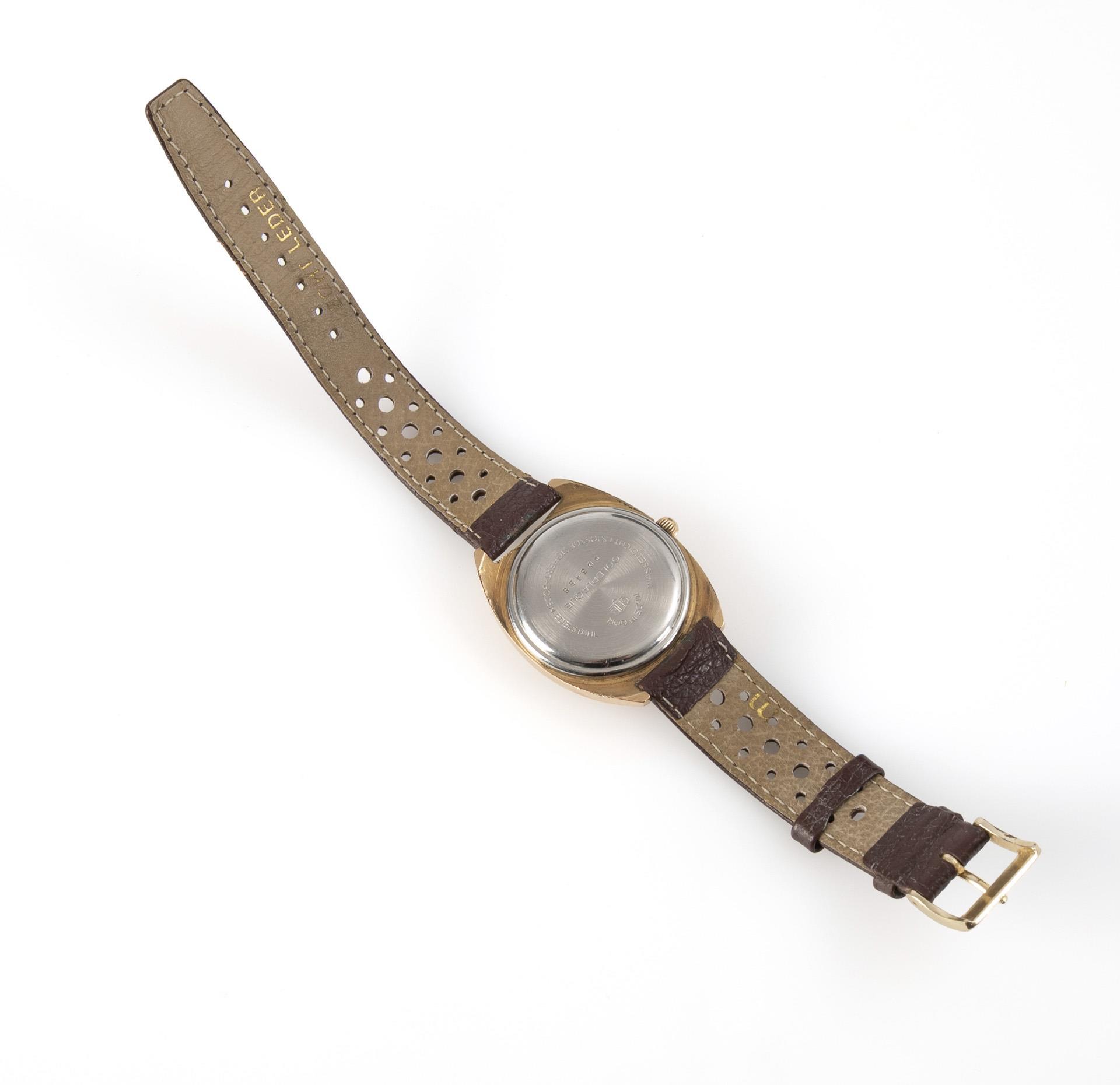Tonneauförmiges Gehäuse, an braunem Lederband mit Lochmusterung und Dornschließe. Leichte Alters- und Gebrauchsspuren, Band wohl ergänzt.
