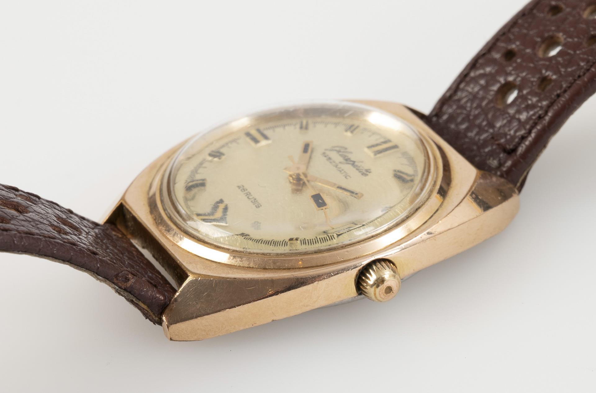 Automatikwerk mit Stellkrone. Im Kurzzeittest funktionstüchtig. Goldfarbenes Strukturziffernblatt mit Stundenmarkierungen, Minutenkranz mit 1/5-Sekunden-Einteilung, Zentralsekunde und Datum bei der 3, Baton-Zeiger.