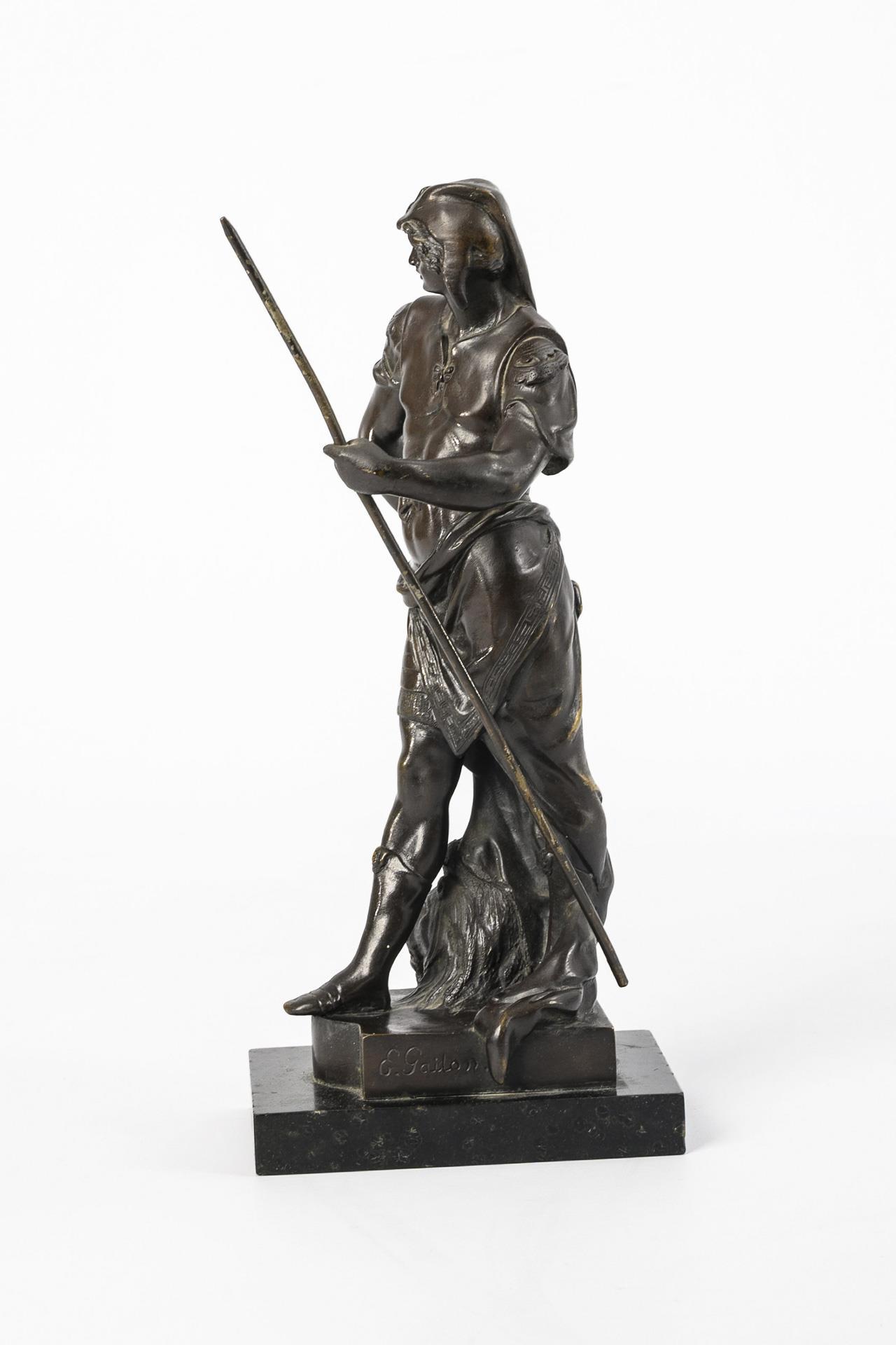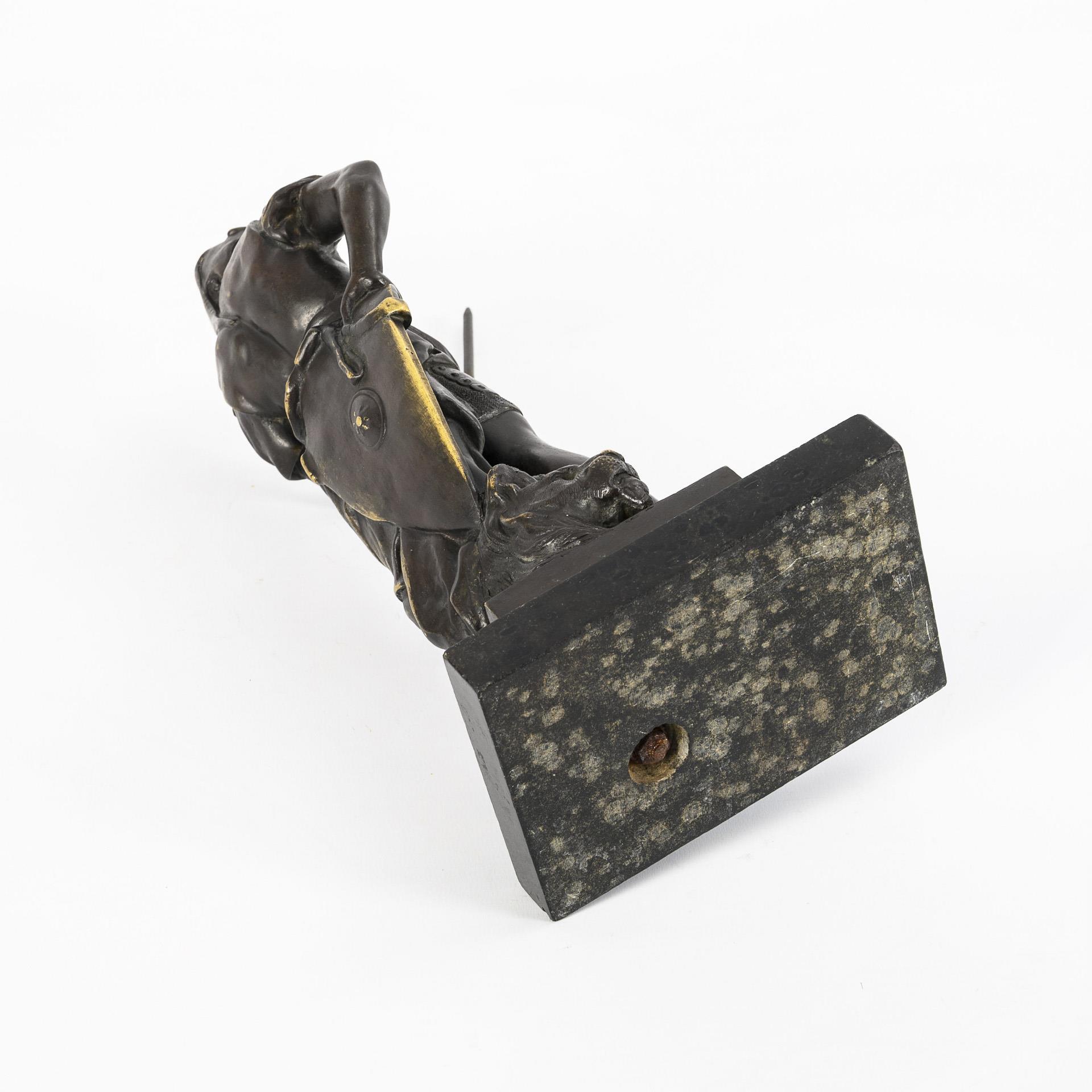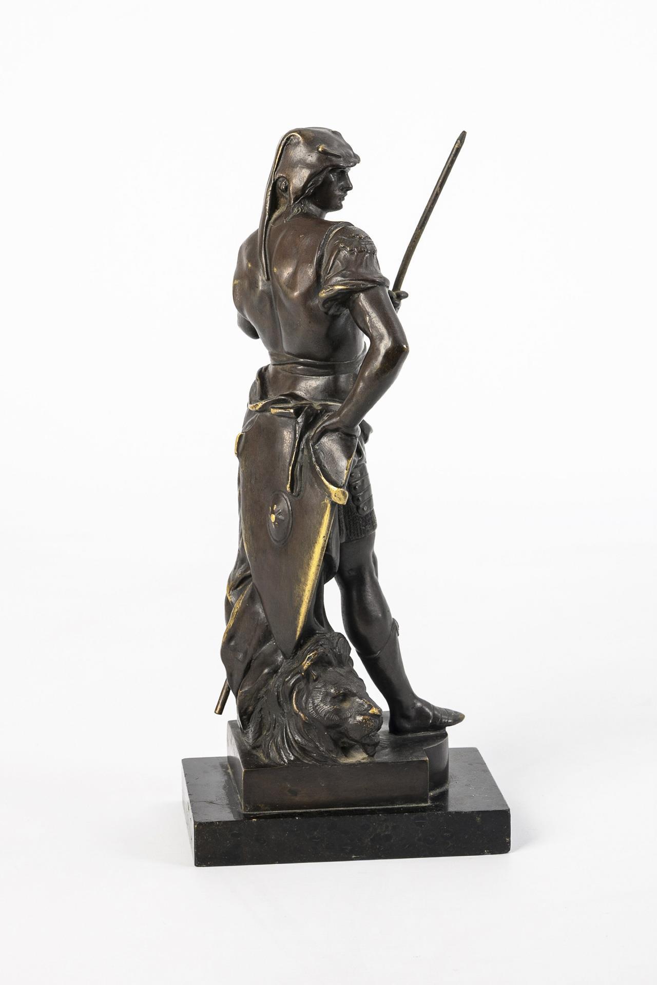Stehender Krieger in Rüstung mit Schild und Speer, auf einem Sockel mit erlegtem Löwen. Leichte Alters- und Gebrauchsspuren.