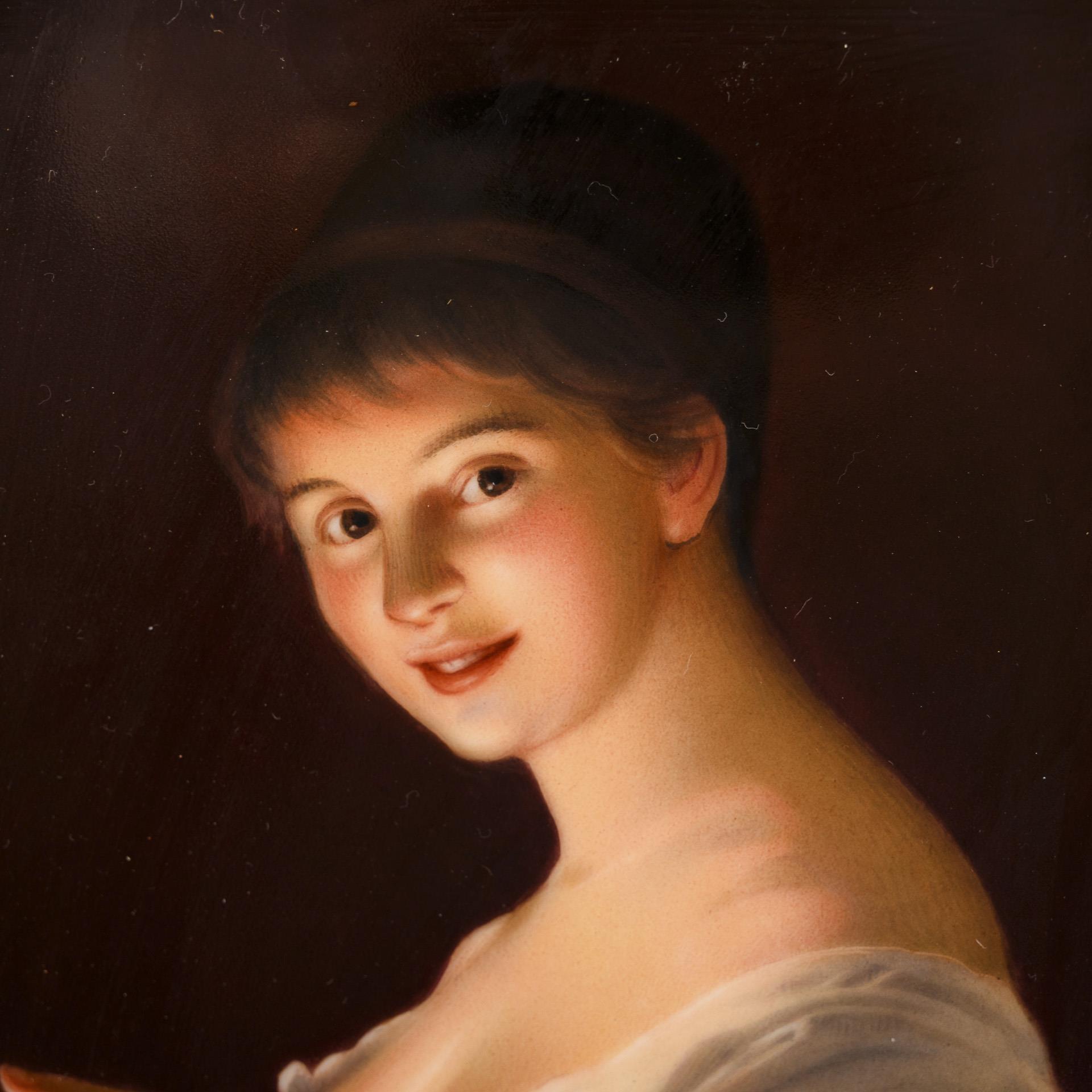 Rechteckige Platte mit der Darstellung einer jungen Frau im Nachtgewand, die Hand schützend vor ein Kerzenlicht haltend, nach einem Gemälde des Malers Georg Hom (1838-1911).