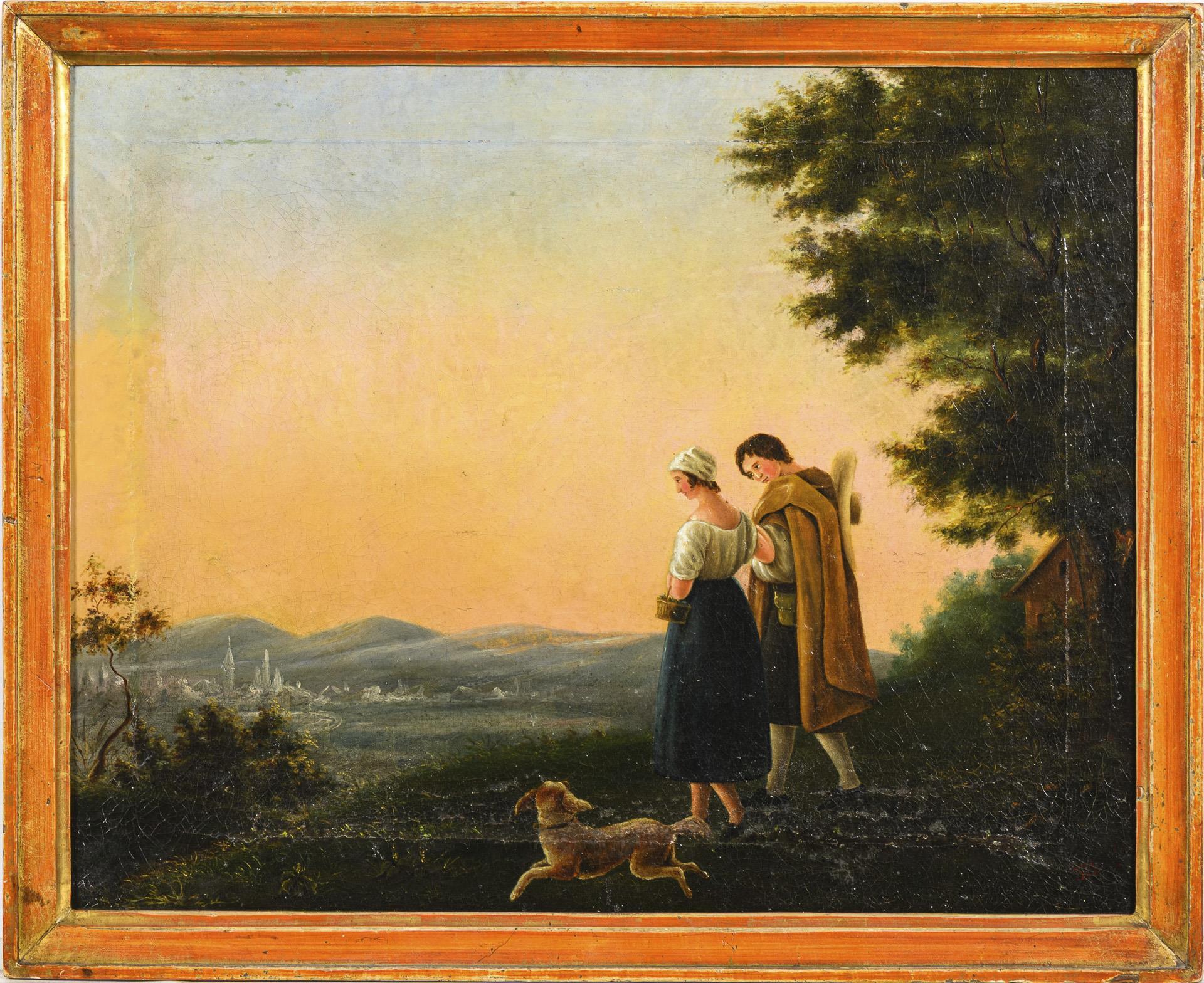 Das Paar mit dem Hund auf einer Wiese am Waldrand nahe einer Hütte am Abend mit Blick zur Stadt im Tal vor den Bergen. Eine kleine restaurierte Stelle mit Hinterklebung.