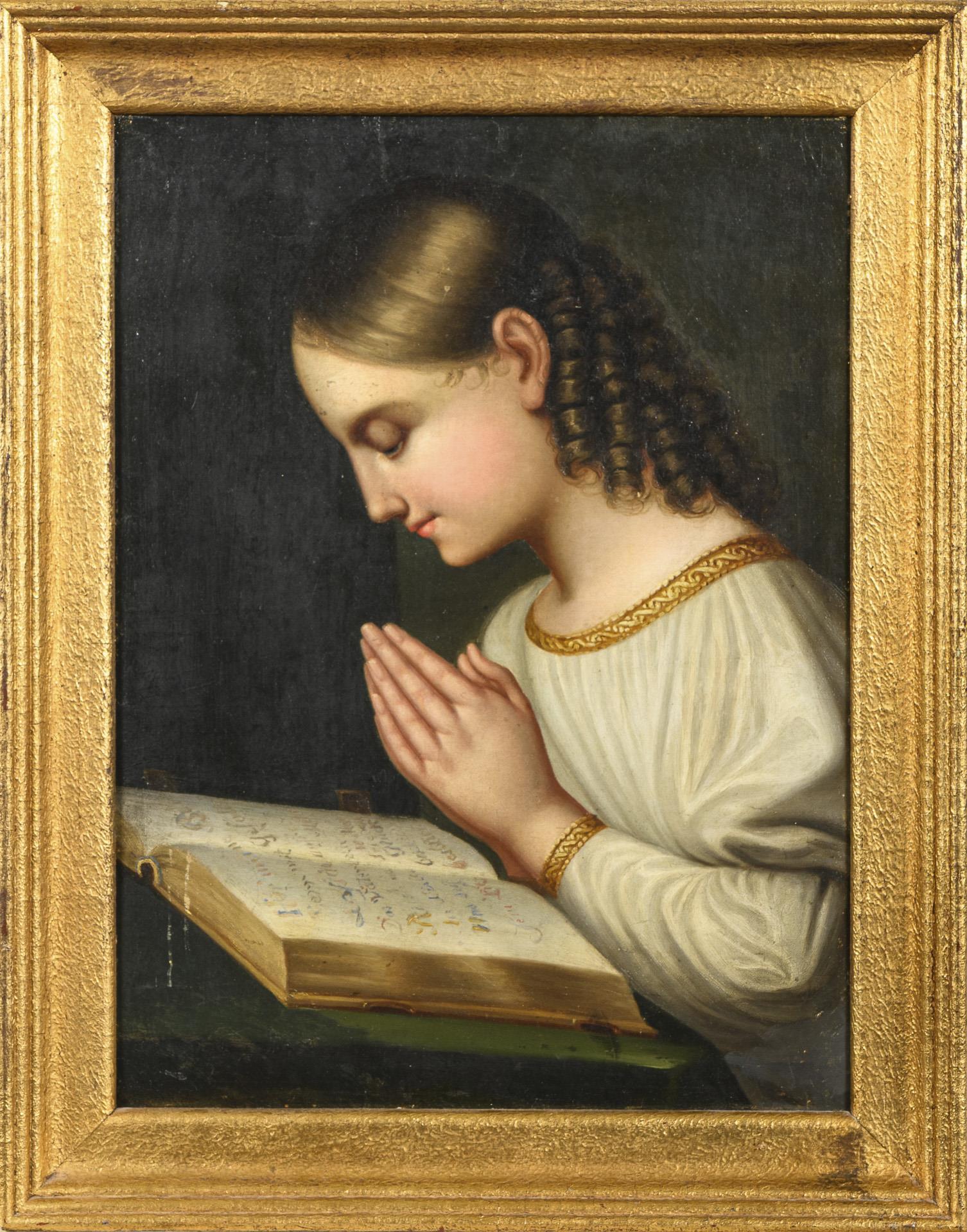 Bildnis eines Mädchens mit über einem Buch gefalteten Händen. Altersspuren.