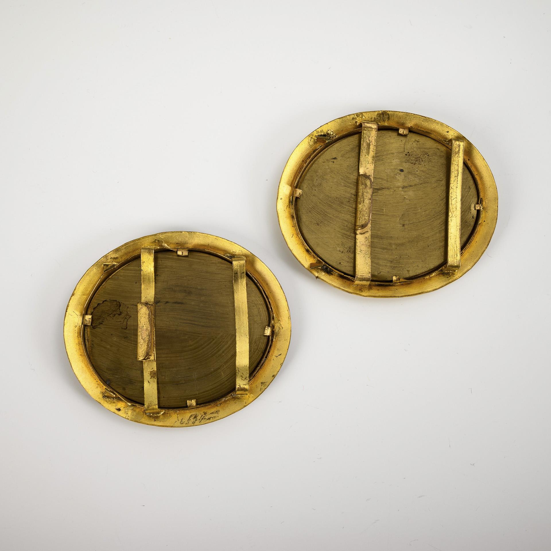Ovale Medaillons, fein bemalt 1x mit dem Porträt der Marie Antoinette nach einem Gemälde von Elisabeth Louise Vigee-Lebrun (1755-1842) und 1x mit dem Porträt der Herzogin von Devonshire nach einem Gemälde von Thomas Gainsborough (1727-1788). Jeweils im vergoldeten Messingrahmen (geprüft).