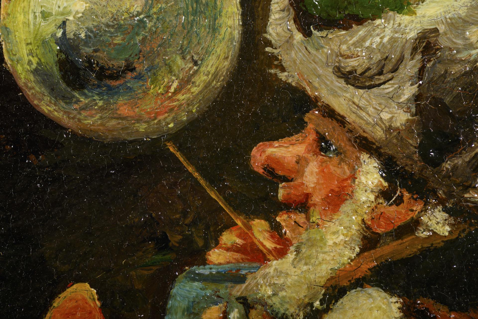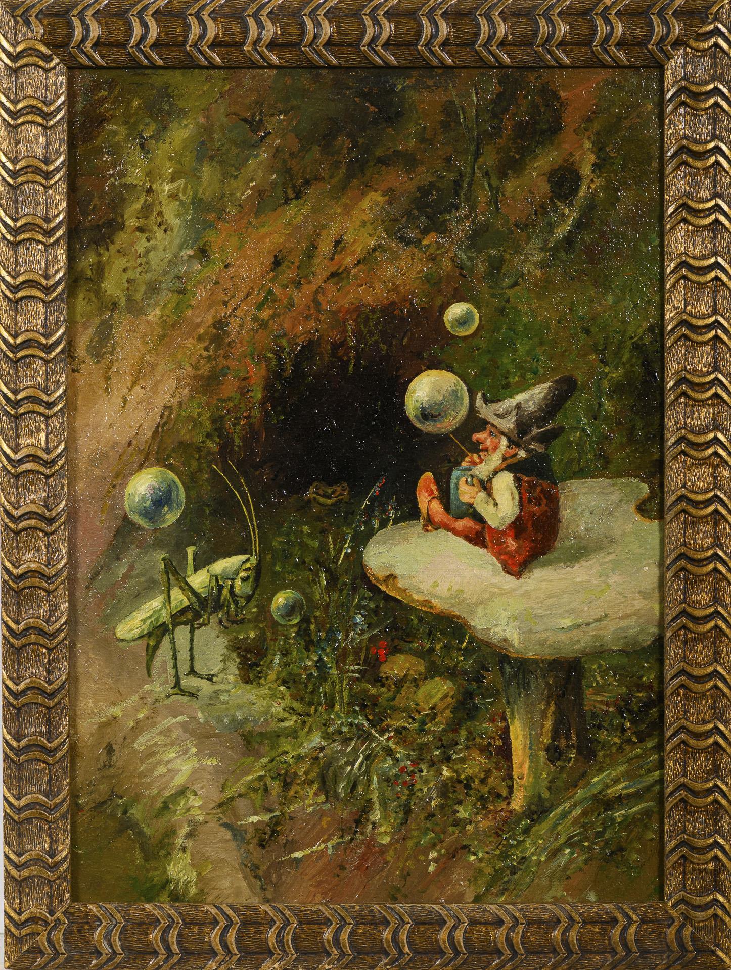 Auf einem Pilz sitzender Zwerg beim Seifenblasen-Machen, daneben der grüne Grashüpfer.
