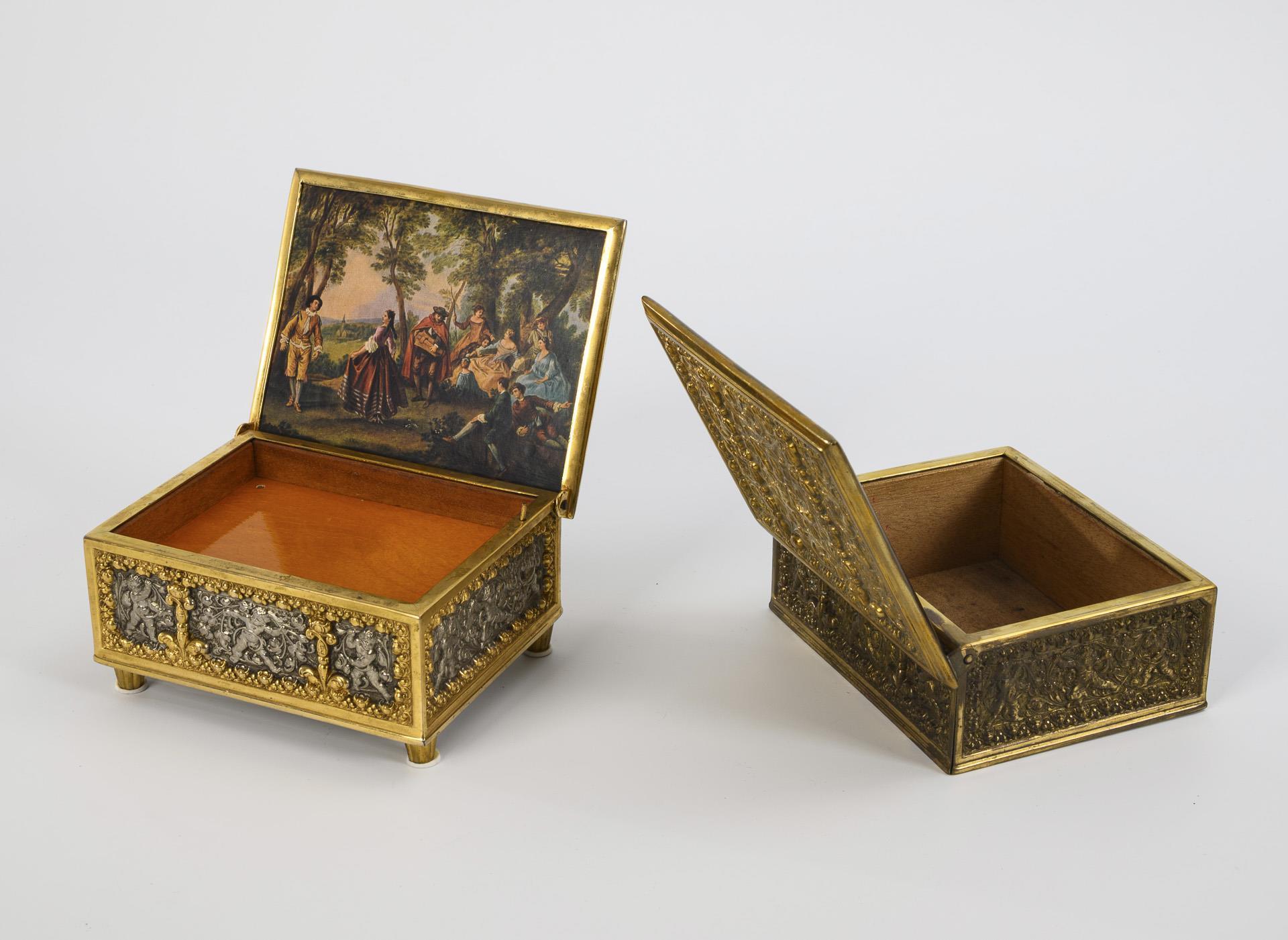 Eine reich reliefierte Flachdeckeltruhe, innen nicht ausgekleidet, mit Kleberückständen von möglicher Filzanbringung am Boden (12,5 x 5 x 10 cm). Eine reich reliefierte Schatulle mit teils silberfarbenem Überzug als Spieluhr (noch funktionsfähig) und einer gedruckten Kopie des Werks "Ein Contretanz unter Bäumen" von Nicolas Lacret im Deckelinneren (12,5 x 6 x 10 cm). Drei mit reichem Reliefornament versehene Zigarrenspender (H 9,5 cm, D 8,5 cm; 2x H 10 cm, D 8,5 cm). Alters- und Gebrauchsspuren.
