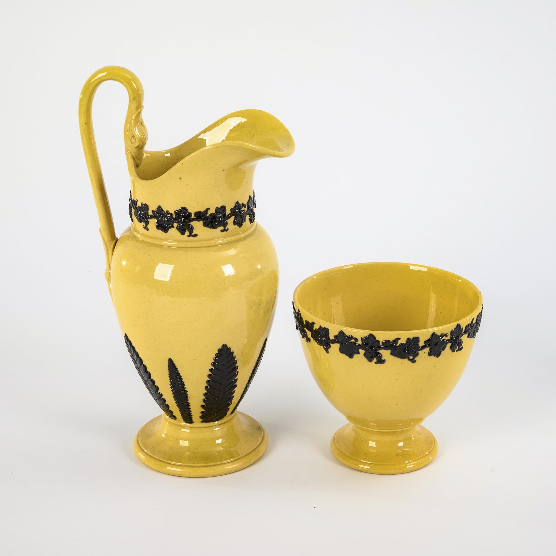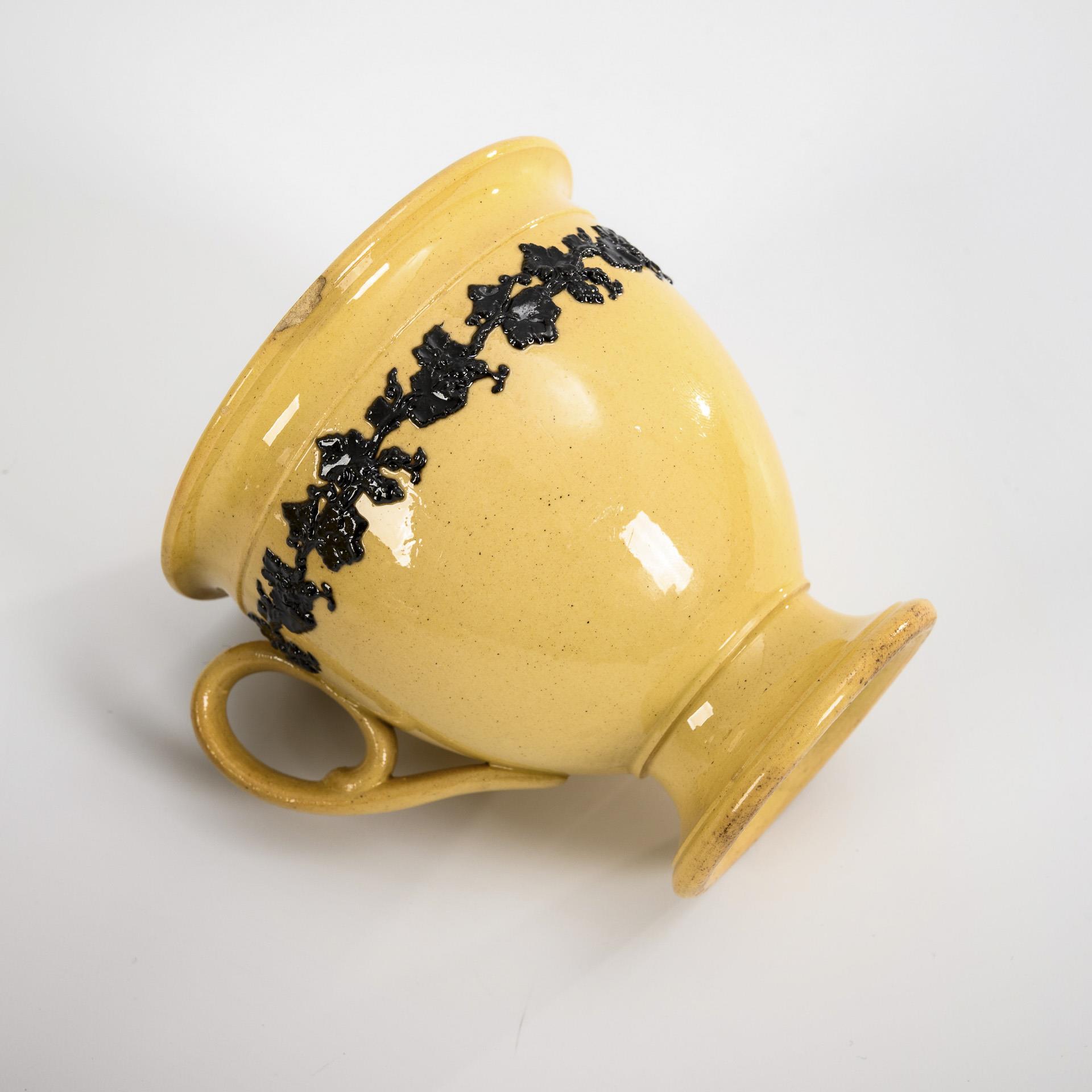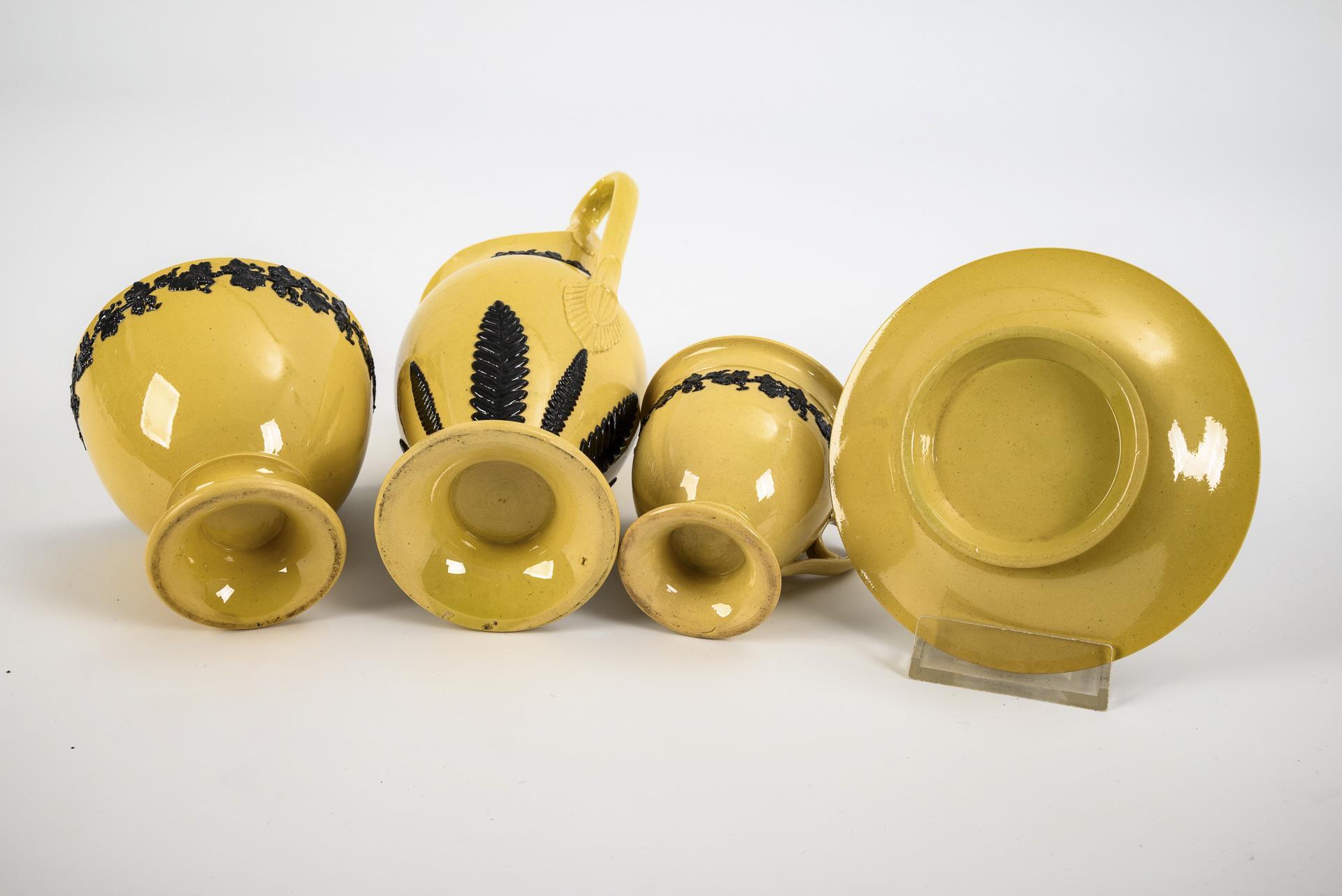 Steingut, gelbe Glasur, Auflagendekor in Schwarz. H max. 22 cm, Teller Ø 13,5 cm.