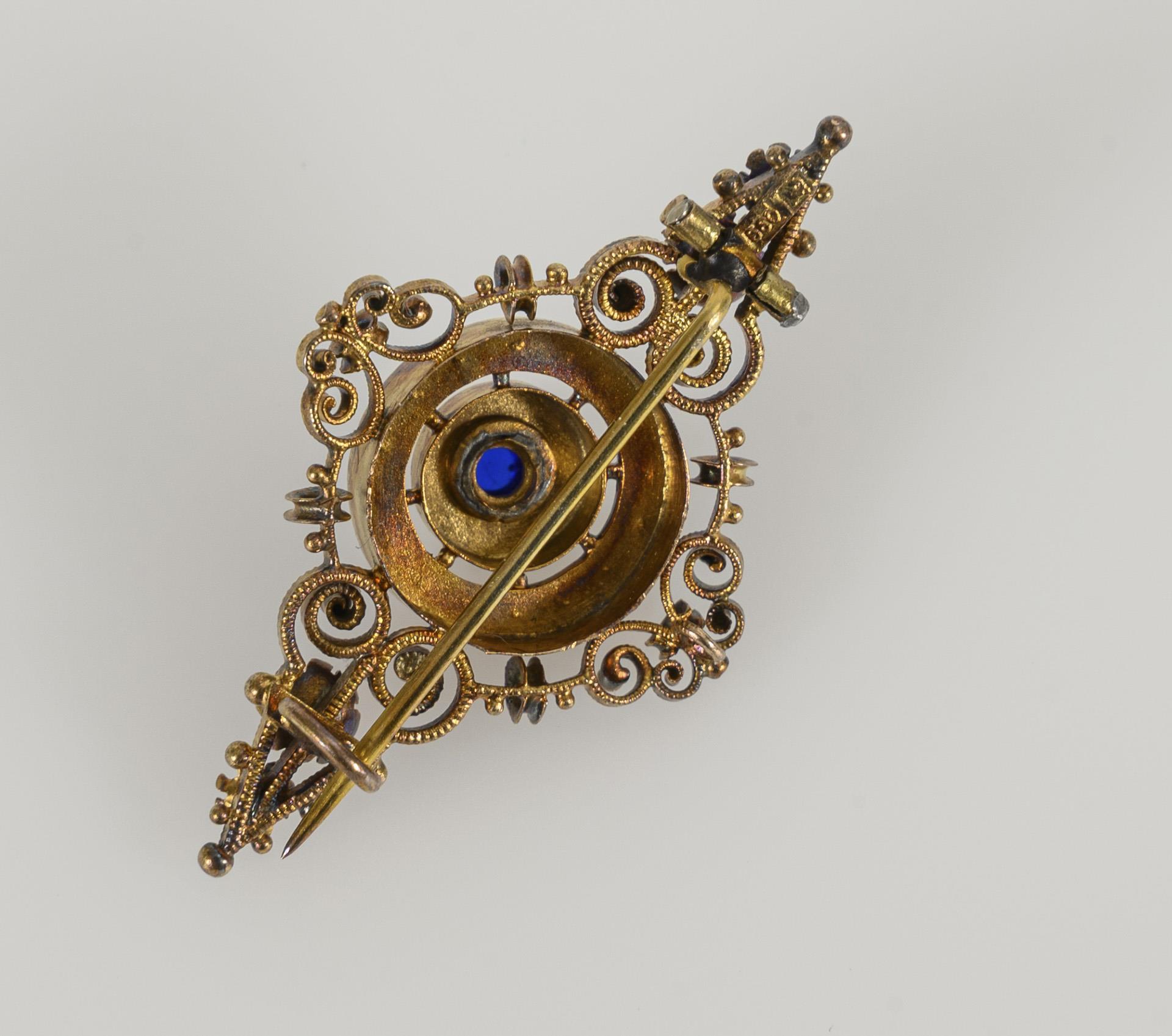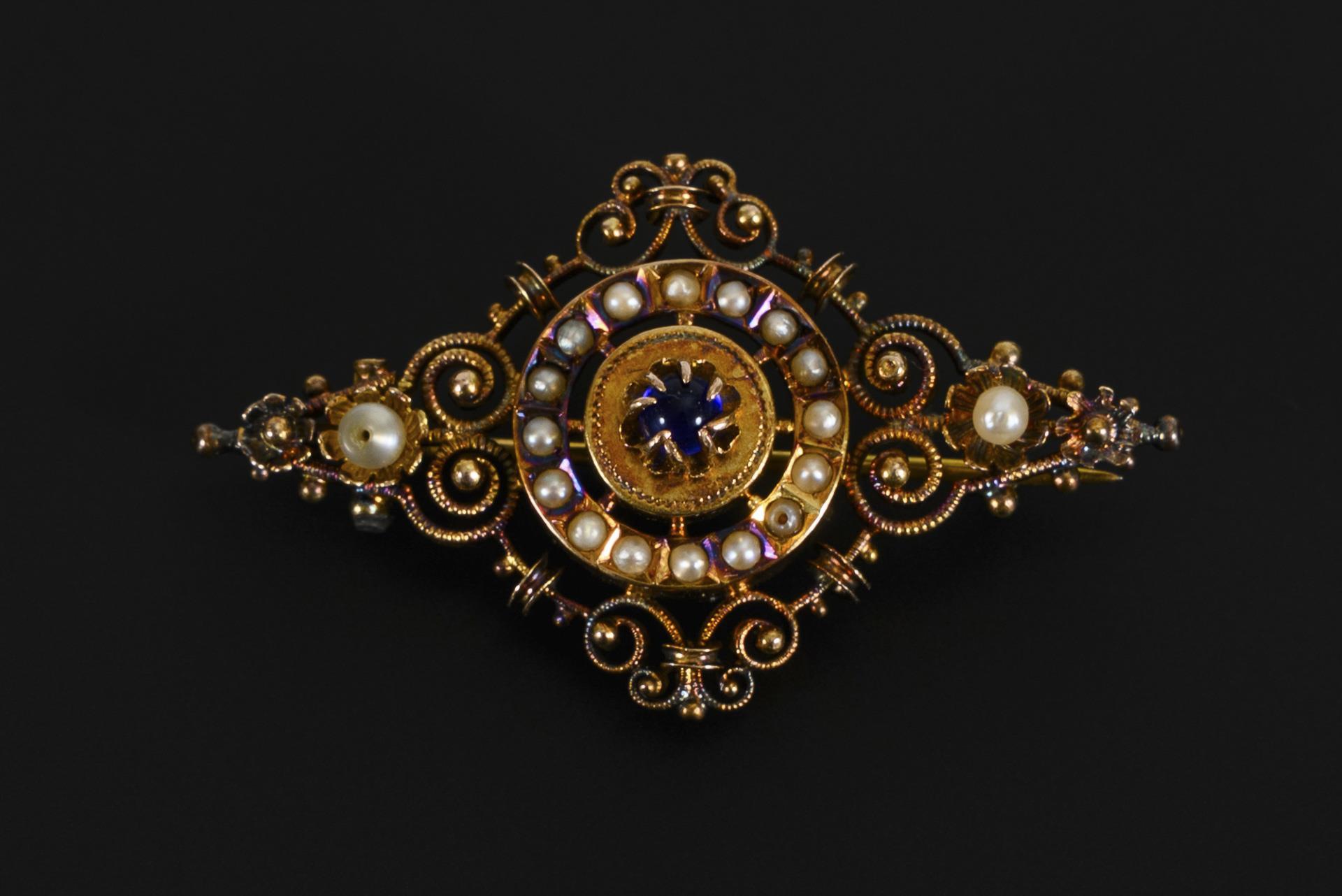 Brosche aus der Zeit um 1860-80 in filigraner Ausführung besetzt mit Saatperlen und einem blauen Glascabochon. Die Nadel mit zeittypischem, einfachen Hakenverschluss. 2 durchbohrte Perlen wohl ergänzte Nachbildungen, Oxydationsspuren.