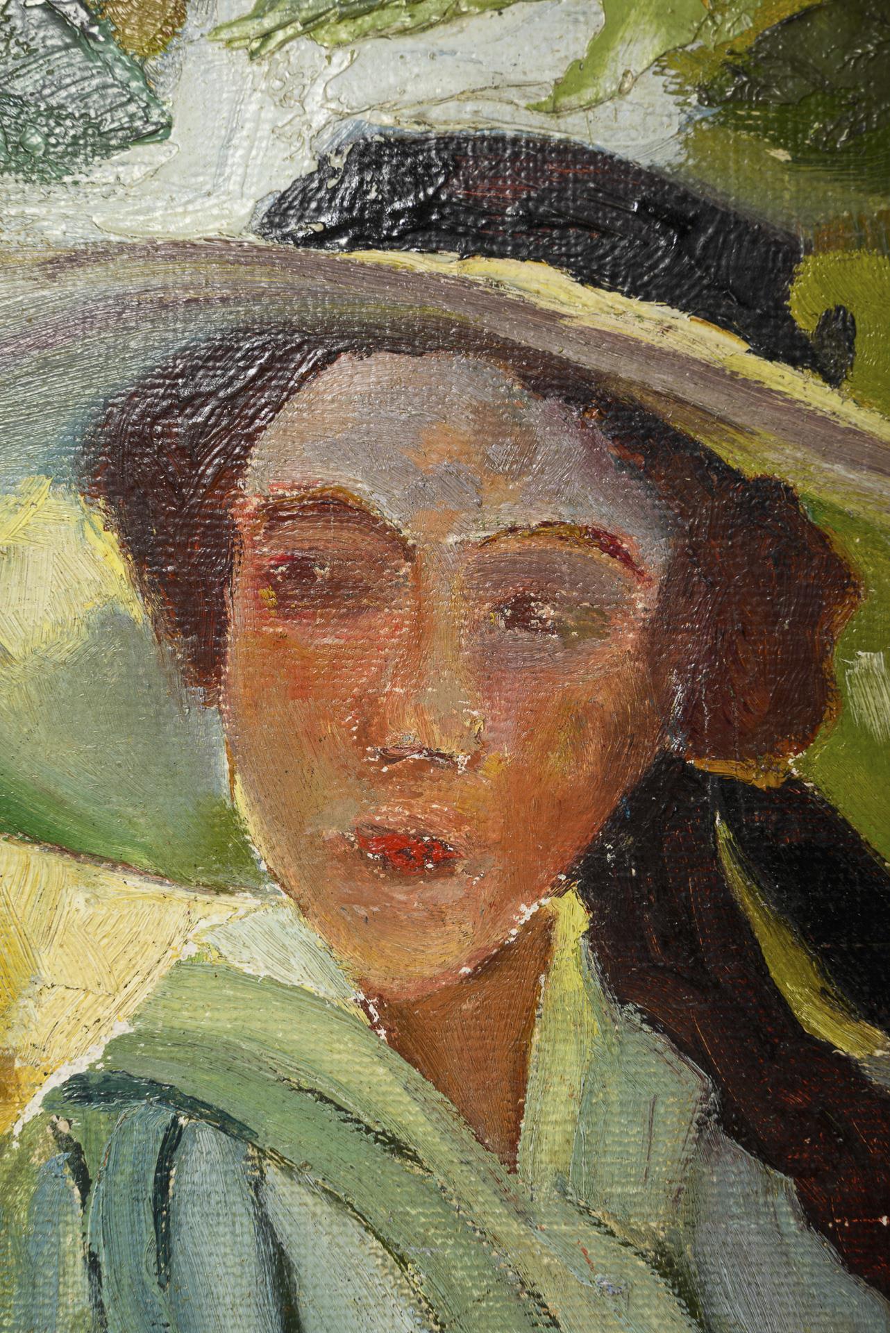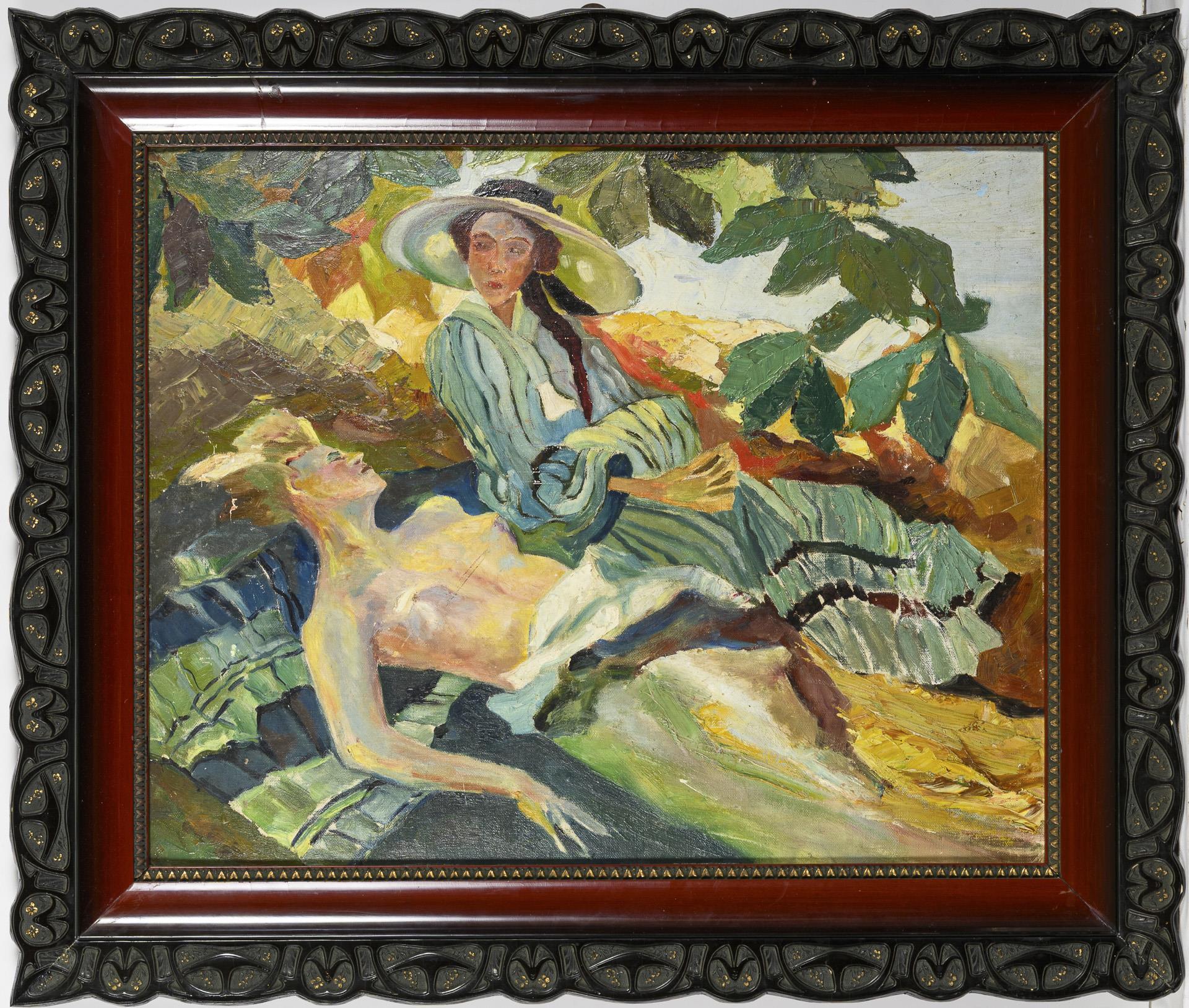 Die beiden Frauen auf einer Decke am Ufer im Schatten der Bäume. Kratzer.