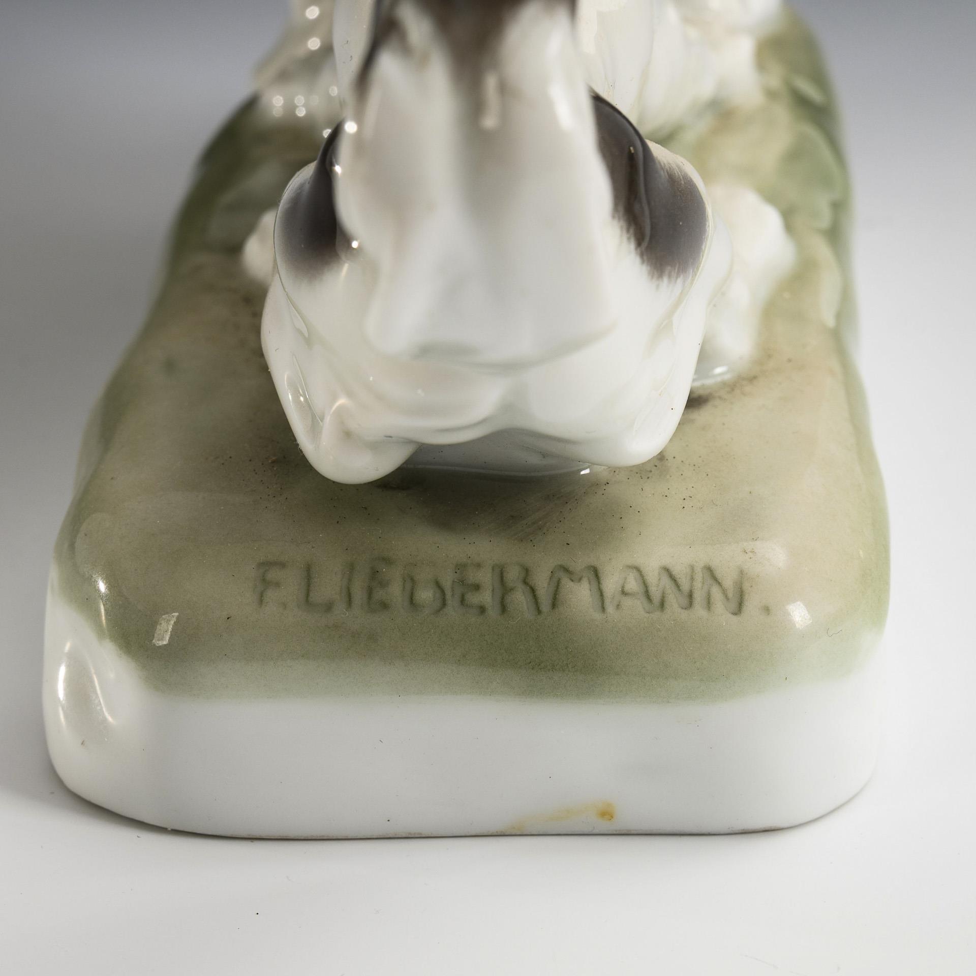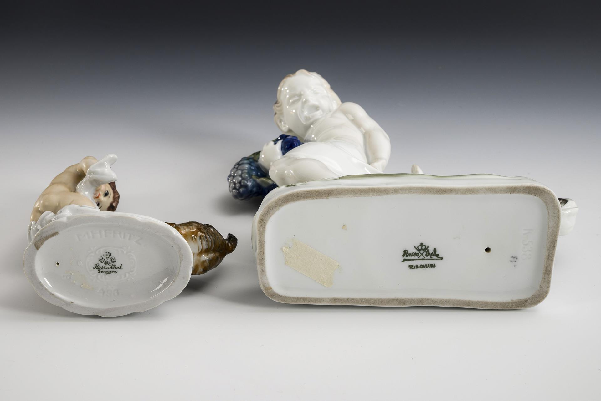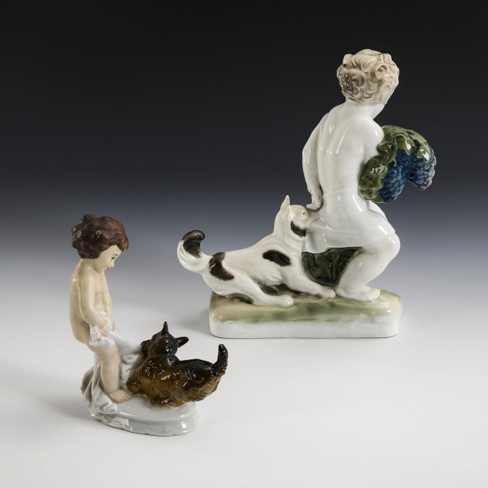 1x "Erwischt", Modell-Nr. 538, Entwurf 1919 von Ferdinand Liebermann (1883-1941): Putto mit Trauben sowie ein diesen am Lendentuch packender Hund. / 1x "Neckerei", Modell-Nr. 496, Entwurf um 1929 von Max Hermann Fritz (1873-1948): mit einem Terrier spielender Putto.