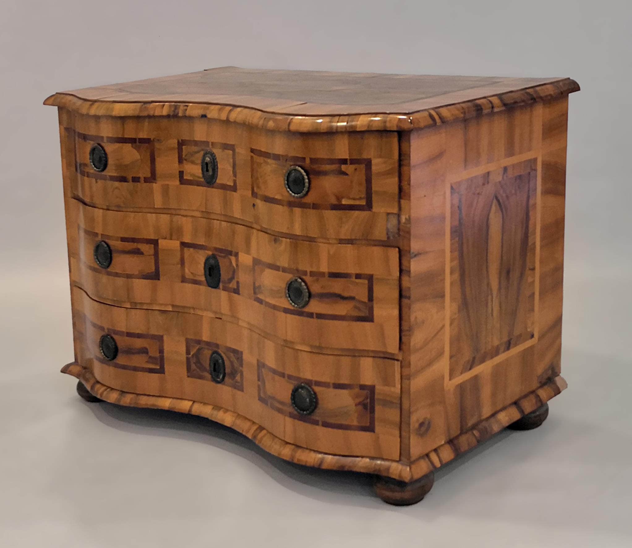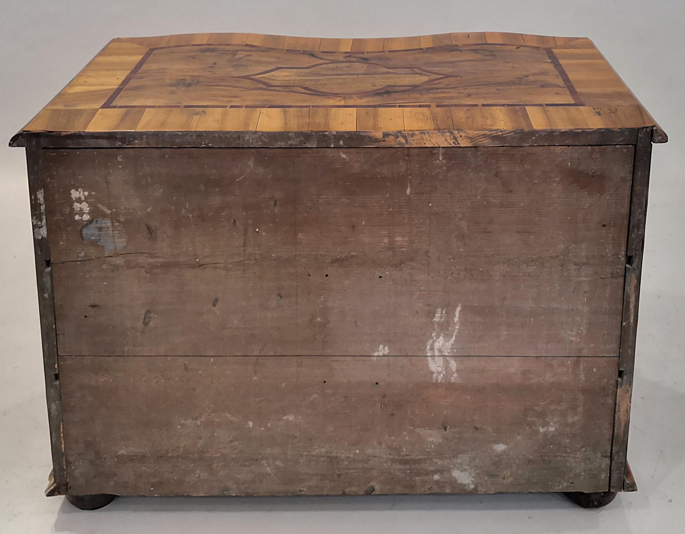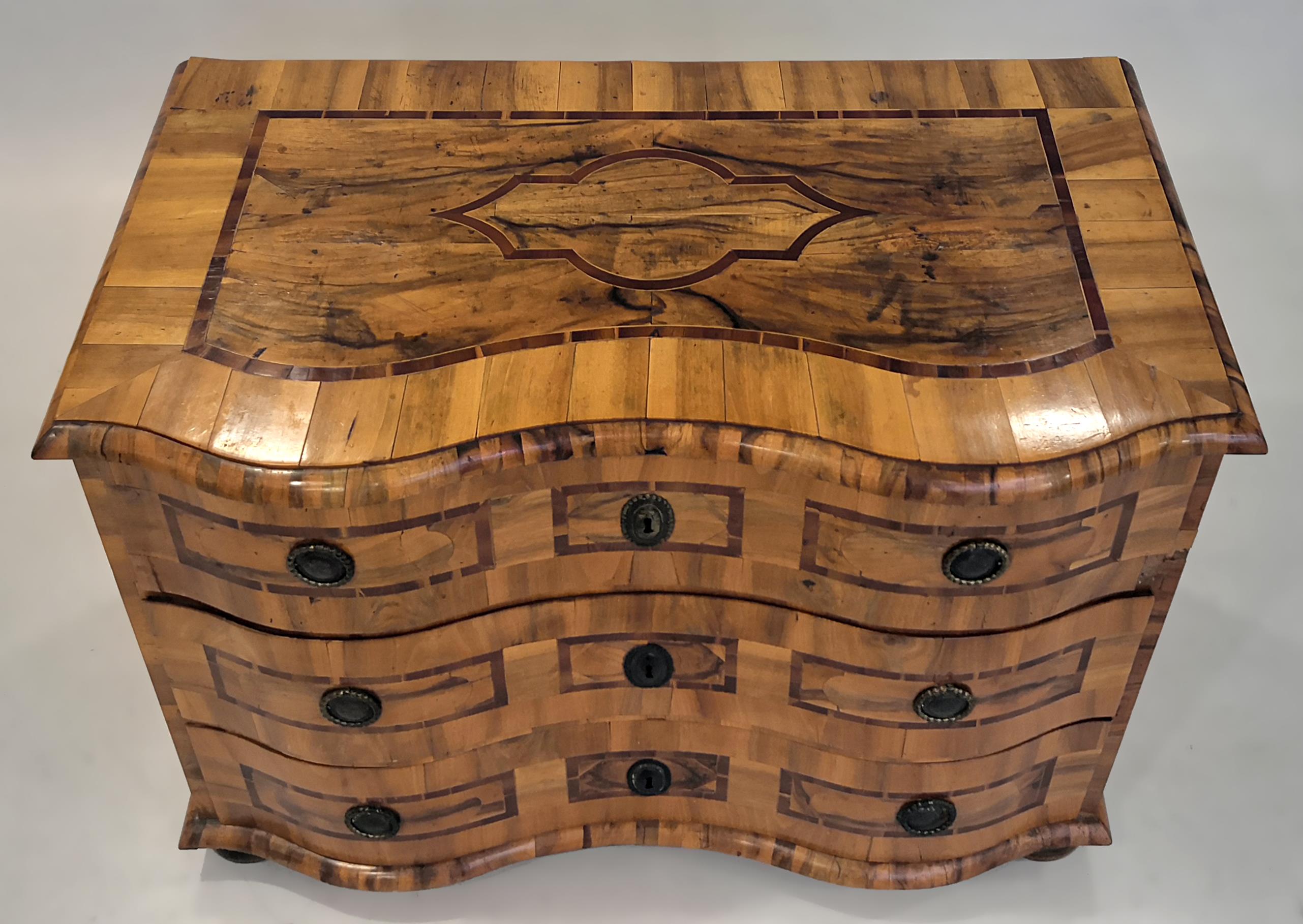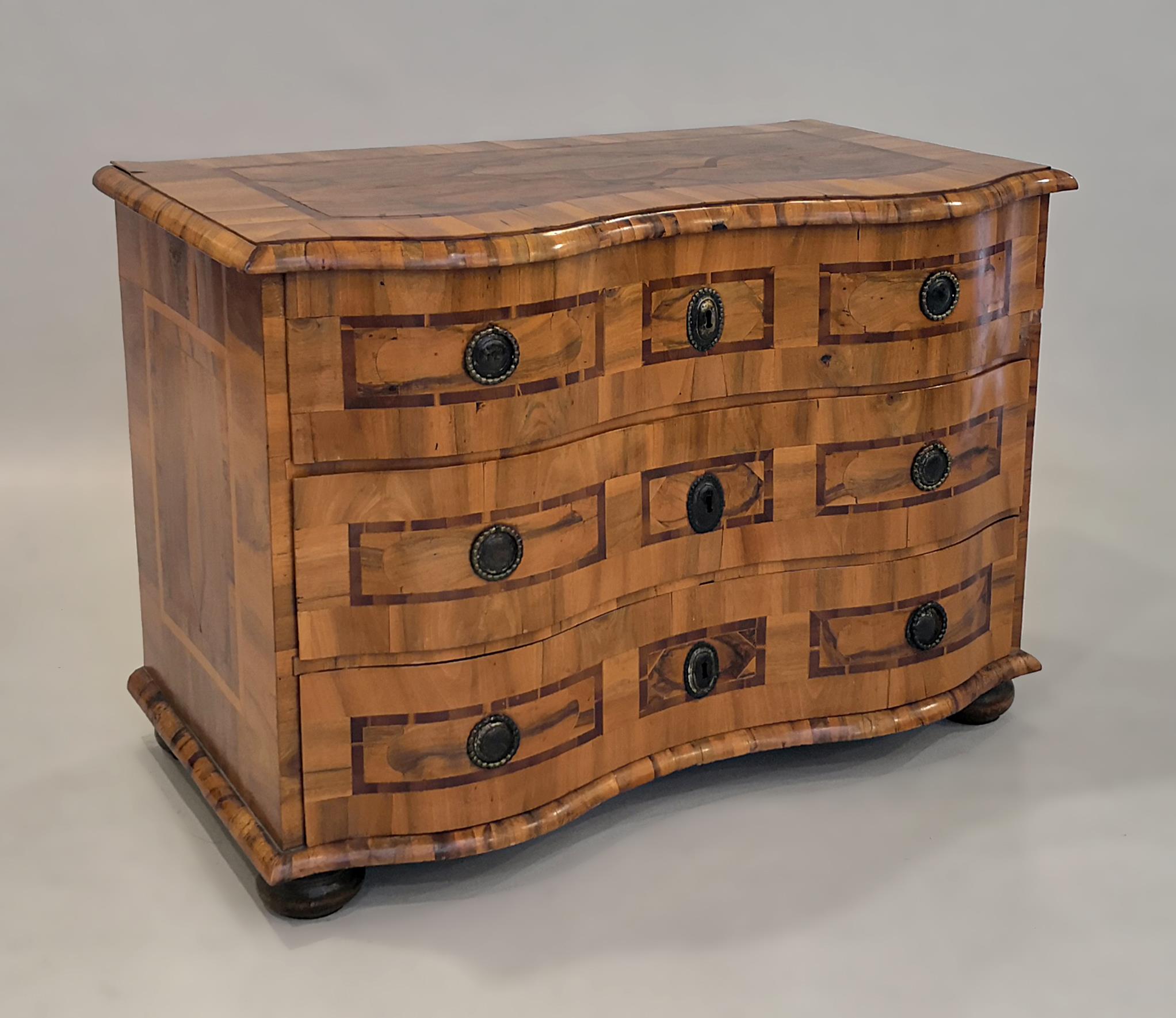 3-schübige Kommode mit geschwungener Form, verziert mit Band- und Kassettenmarketerie und Perlstab-Bronzebeschlägen. Alt restauriert, kleine Furnierdefekte, Platte etwas verzogen, Schloss des oberen Schubs fehlt.