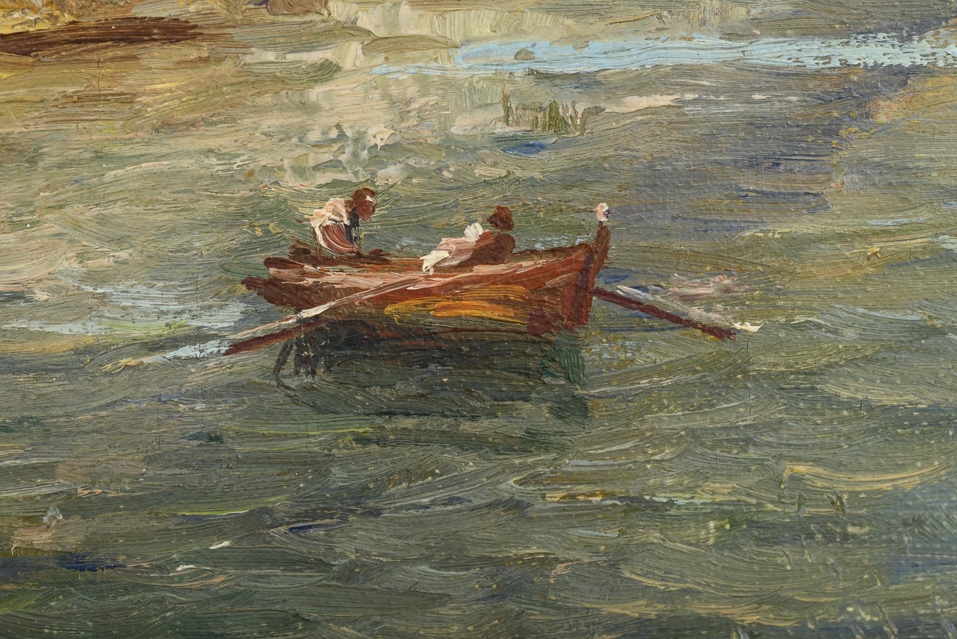 Sonniger Seeblick mit Kahnfahrern unterhalb der steilen Felswände. Leinwand doubliert.