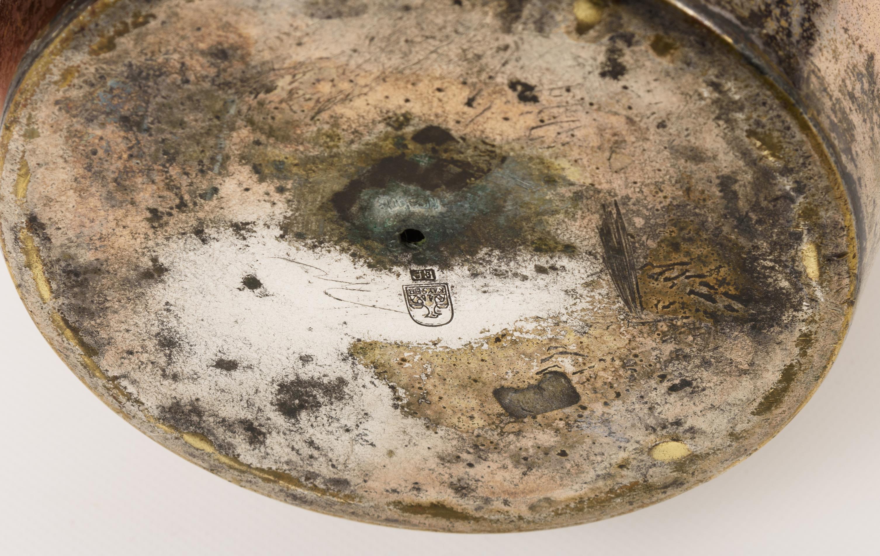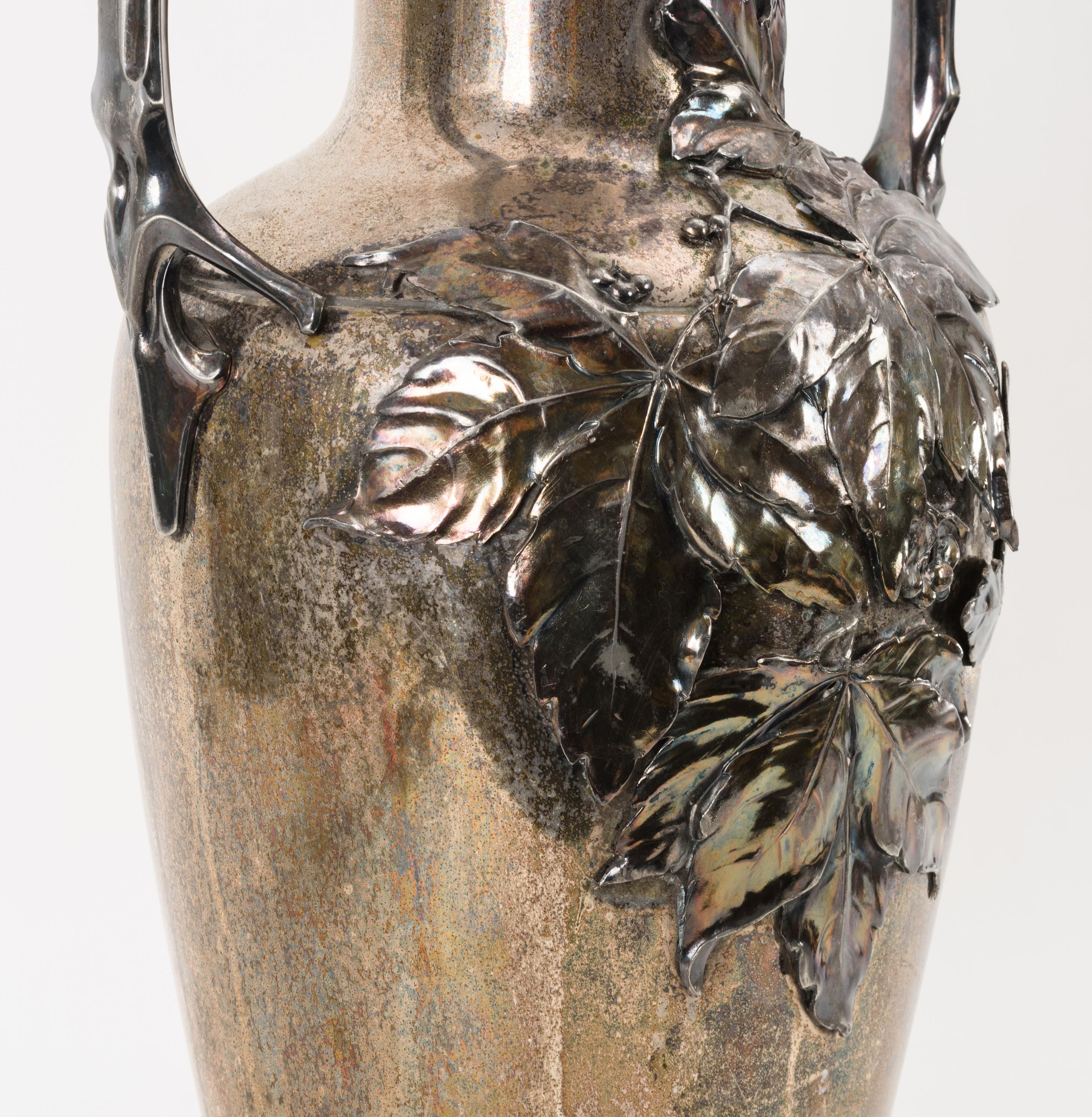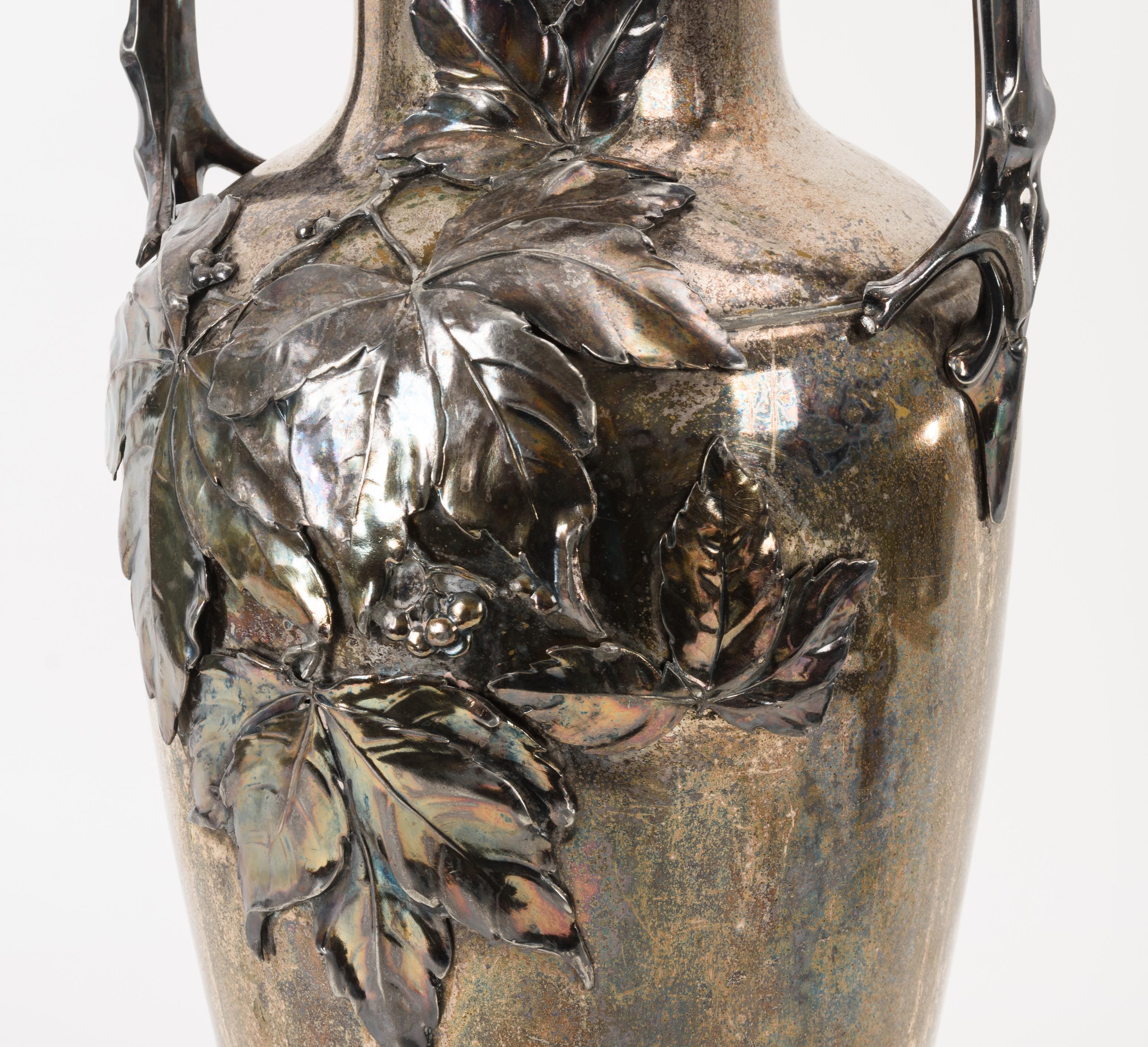 Bodenvase mit schlankem Hals, 2 Henkeln und Blattapplikationen. 1 Henkel locker, Applikationen mit Defekten, Versilberung berieben, Dellen, 1 Bohrung im Boden.