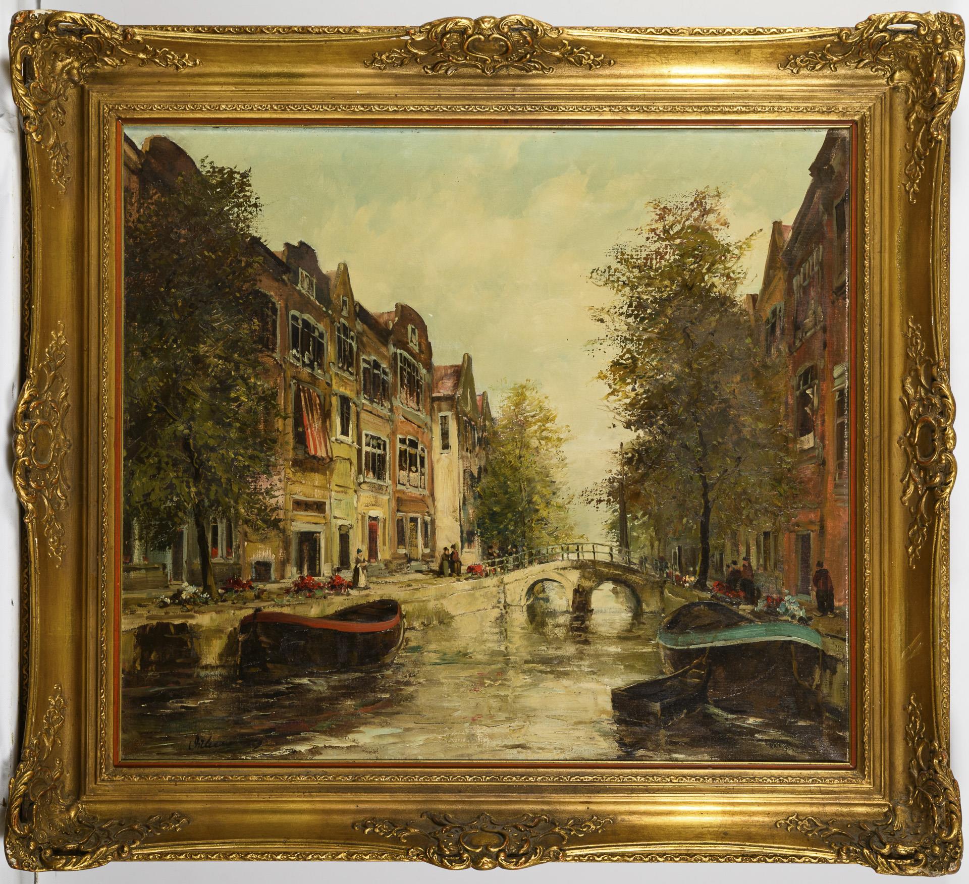 Boote im Kanal nahe der Brücke zwischen den typischen niederländischen Reihenhäusern. Leichte Altersspuren.