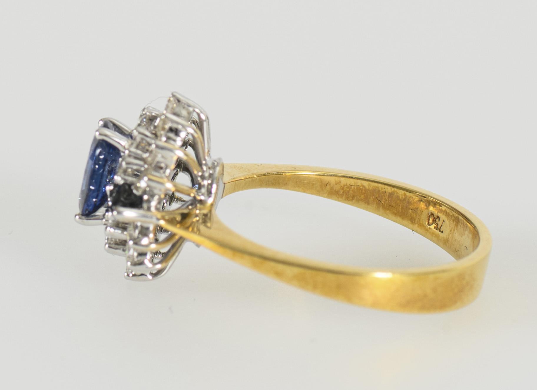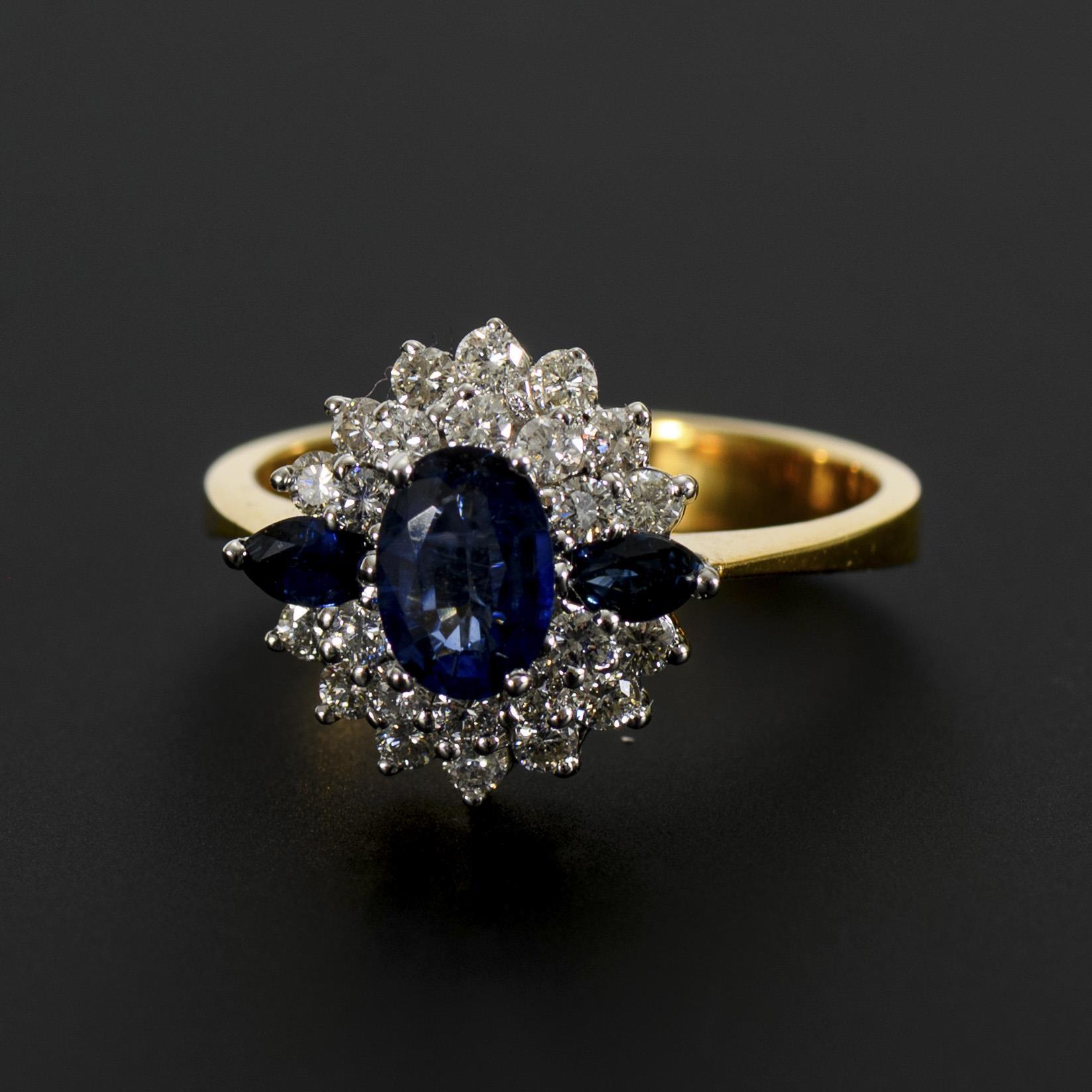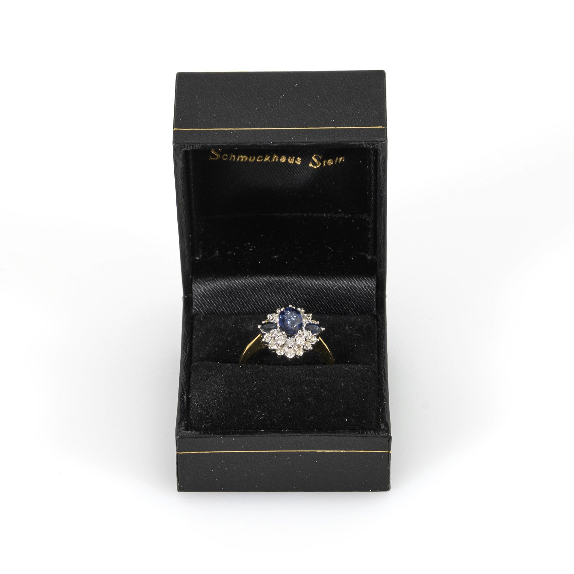Zweifarbiger Ring mit sich nach unten verbreiternder Ringschiene in Gelbgold und in Weißgold gehaltenem Ringkopf, dieser terrassenartig mit 3 blauen Farbsteinen, wohl Saphiren, im Oval- bzw. Navetteschliff sowie Brillanten ausgefasst.