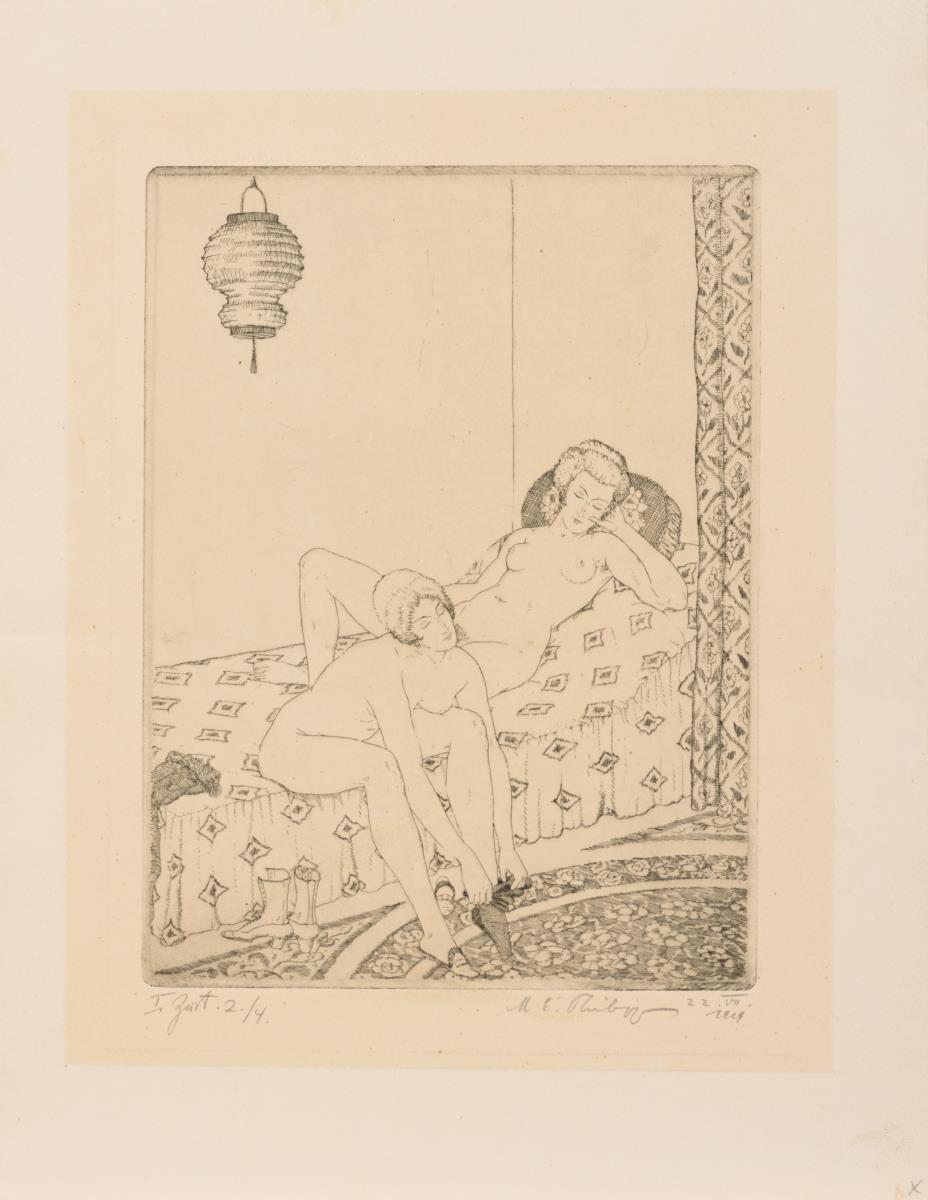 2 laszive weibliche Akte. Lichtschaden, minimal verschmutzt, durchgehender waagerechter Knick.