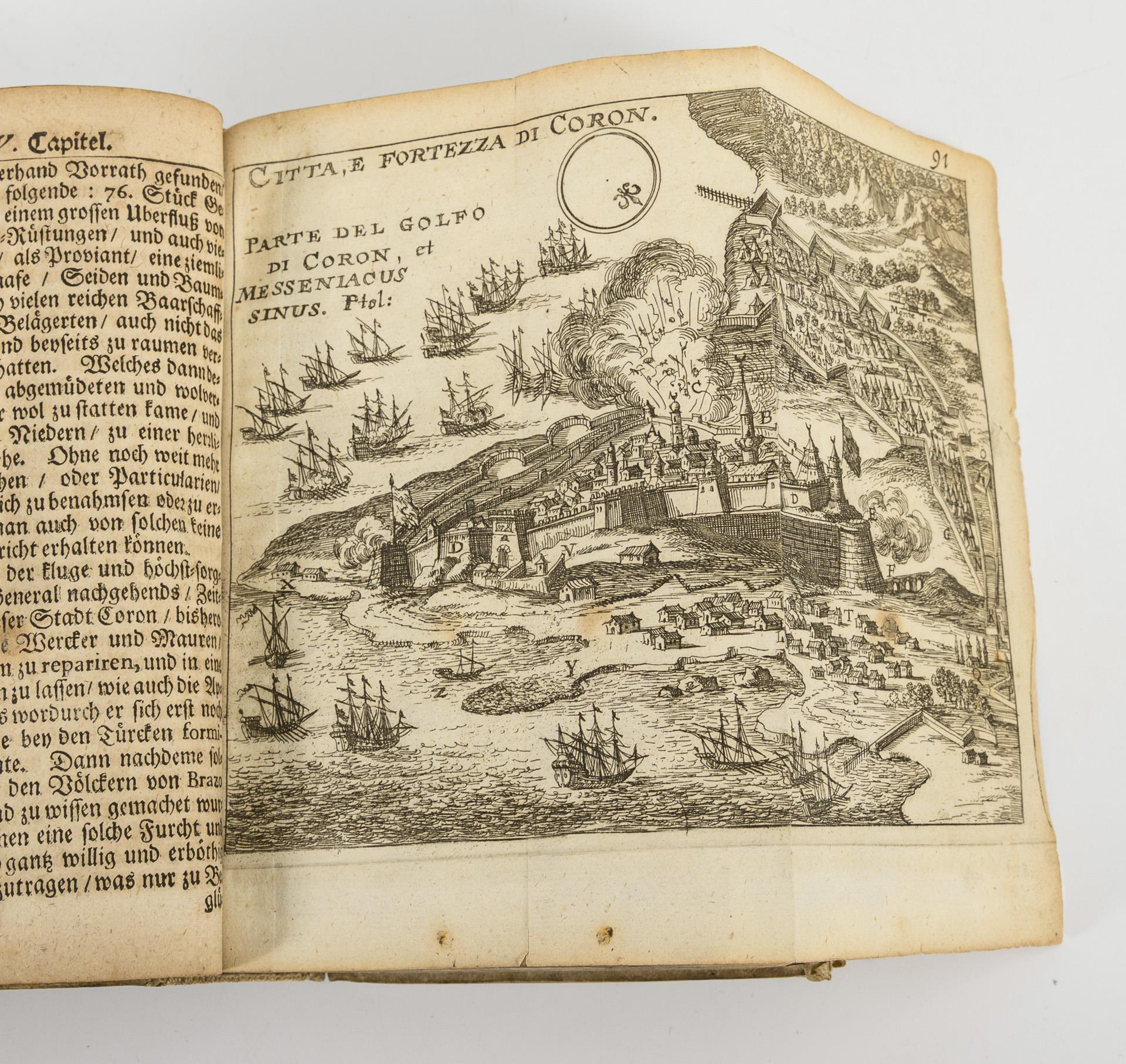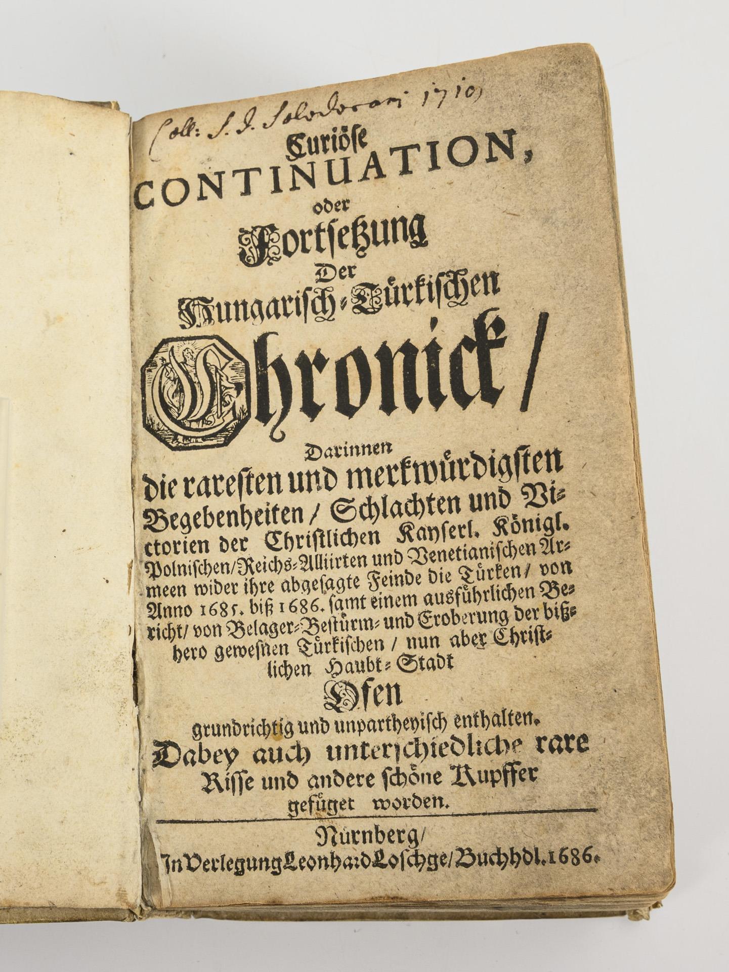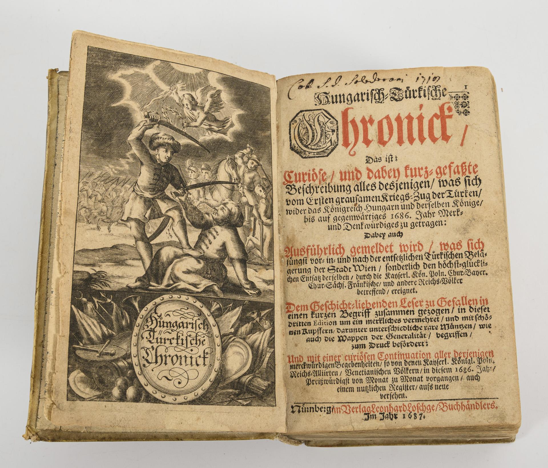 Band 1: Kapitel 1-15. / Band 2: "Curiöse Continuation oder Fortsetzung Der Hungarisch-Türkischen Chronik. Darinnen die raresten und merkwürdigsten Begebenheiten, Schlachten und Victorien der christlichen Kayserl. Königl. Polnischen, Reichs-Allierten und Venetianischen Armeen". Kapitel 1-18. Titelkupfer, Titelblatt, 800, (14) / Titelblatt, 728, (8) Seiten mit einigen ganzseitigen Kupferstichen und insgesamt 10 Faltblättern. In braunen Pergamenteinbänden. Altersgemäß guter Zustand, Gebrauchsspuren. Mindestens 3 Abbildungen sind herausgetrennt. Die Bücher sind nicht kollationiert.