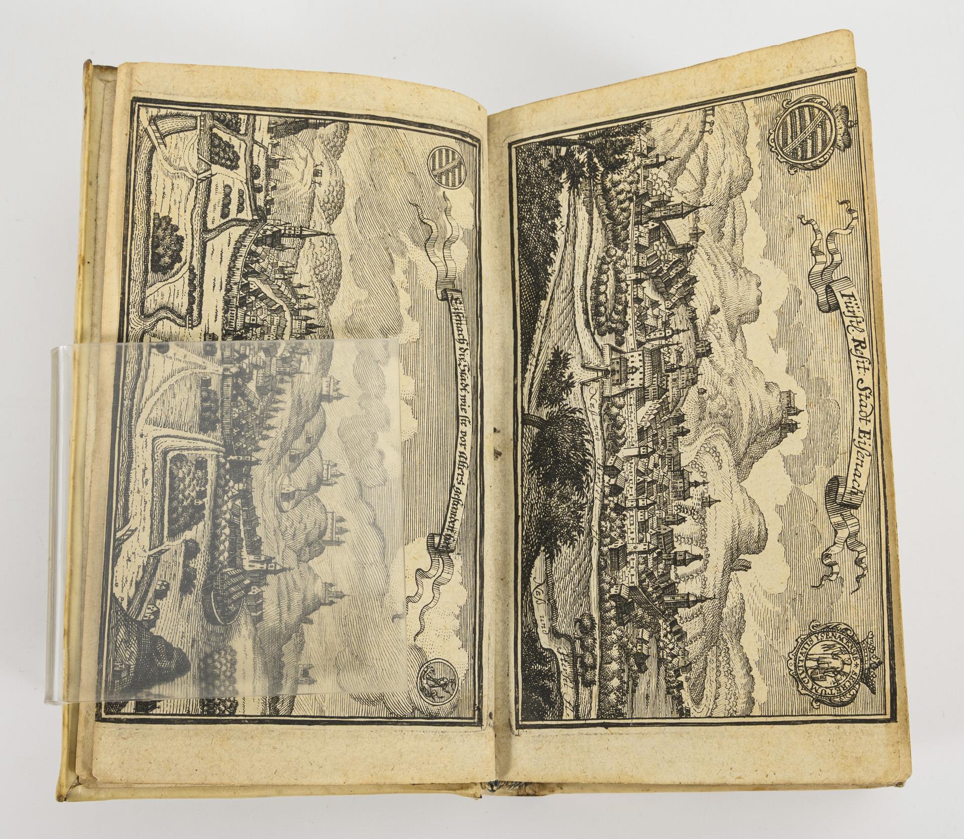 3 Teile in einem Band. 2 Ansichten von Eisenach, Titel als Faltblatt, (20), 51, Seiten / Andrea Toppii: "Historia der Stadt Eisenach, verfasset 1660 ...", 224 Seiten. / J.M.K.: "Historische Erzehlung von ... Wartburg ob Eisenach": (8), 190 Seiten mit 12 Stichen und 3 Faltblättern, (2) Seiten. Wohl vollständig. Im Pergamenteinband. Altersgemäß guter Zustand.