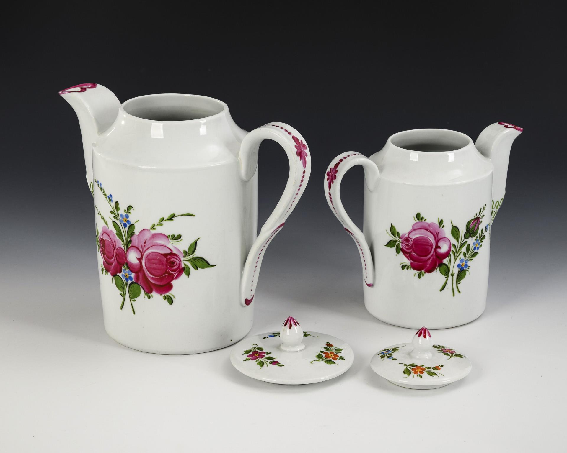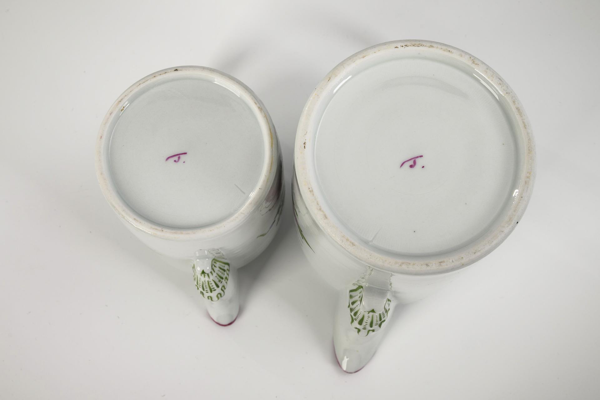 Zylinderkannen mit Ohrenhenkel sowie Rosen- und Vergißmeinnichtmalerei.