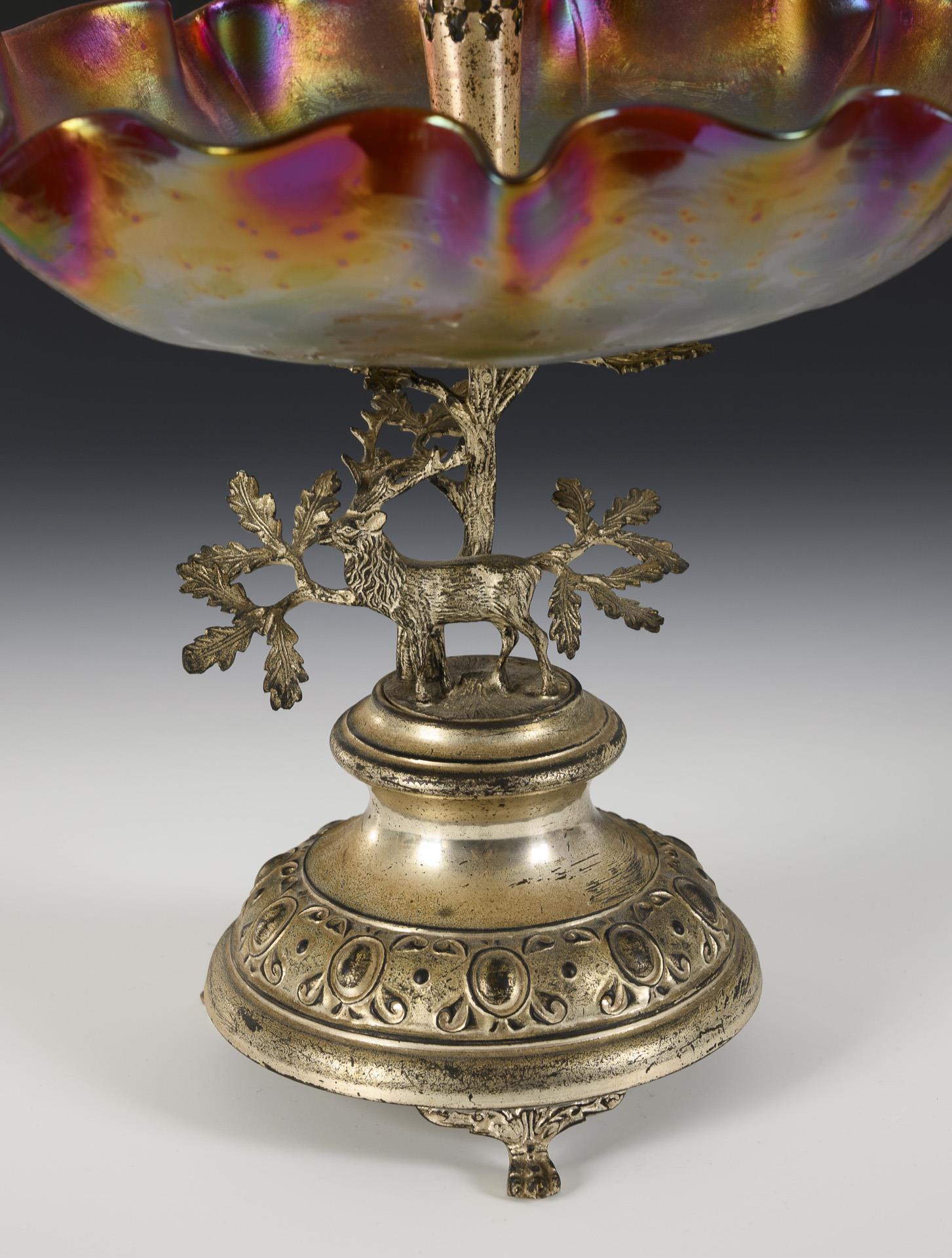 Vaseneinsatz und Schale aus farblosem, irisiertem Glas mit rubinrot verlaufendem Unterfang und eingearbeiteten silbergelben Kröseln. Montiert an ein Metallgestell mit der plastischen Figur eines vor einem Eichenzweig stehenden Hirsches.