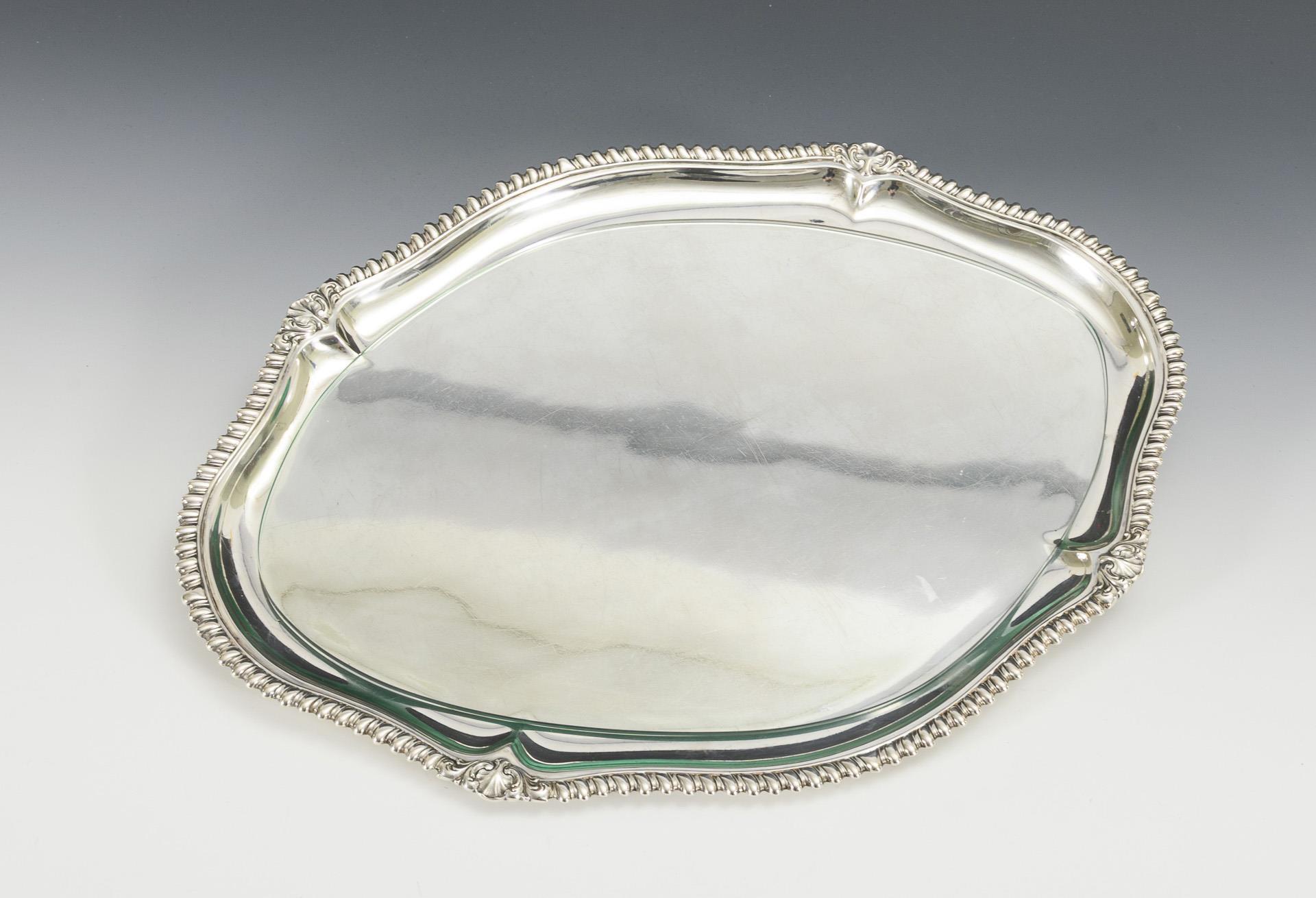 Passig geschweifte Ovalform mit reliefiertem Kordelrand. Glasplatte lose aufliegend. Gebrauchsspuren, Kratzer.