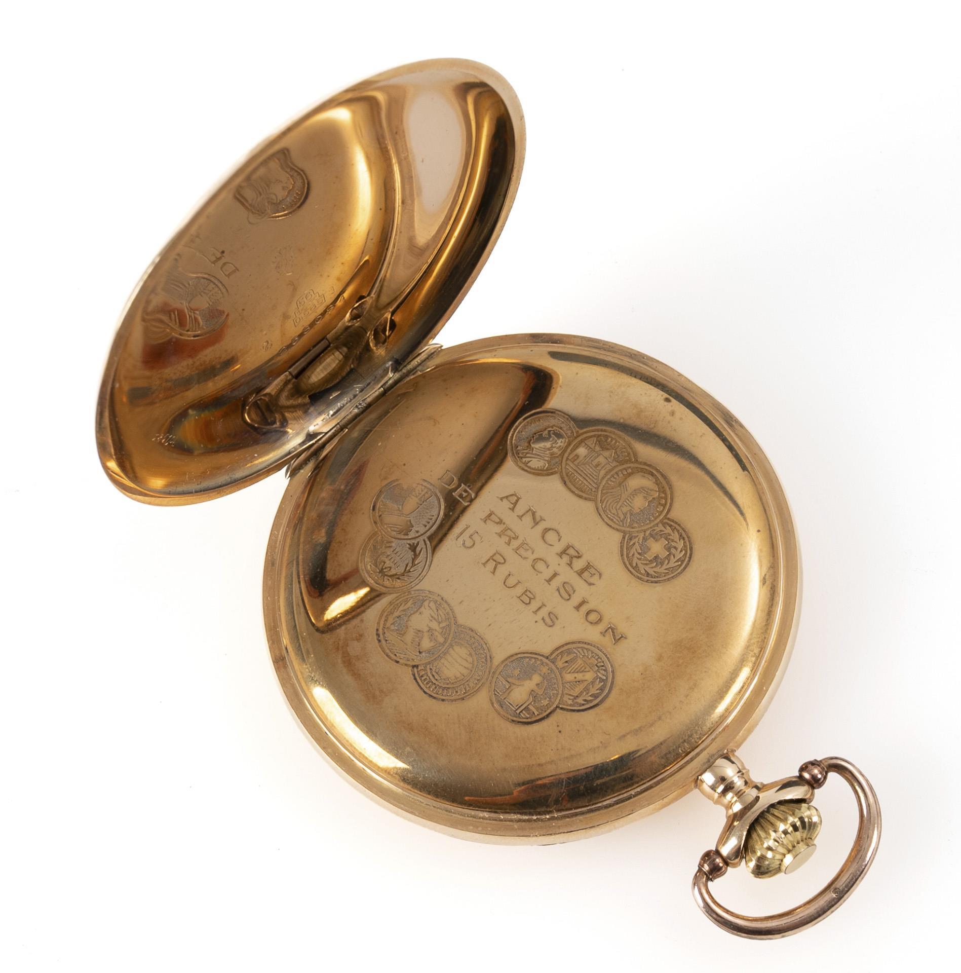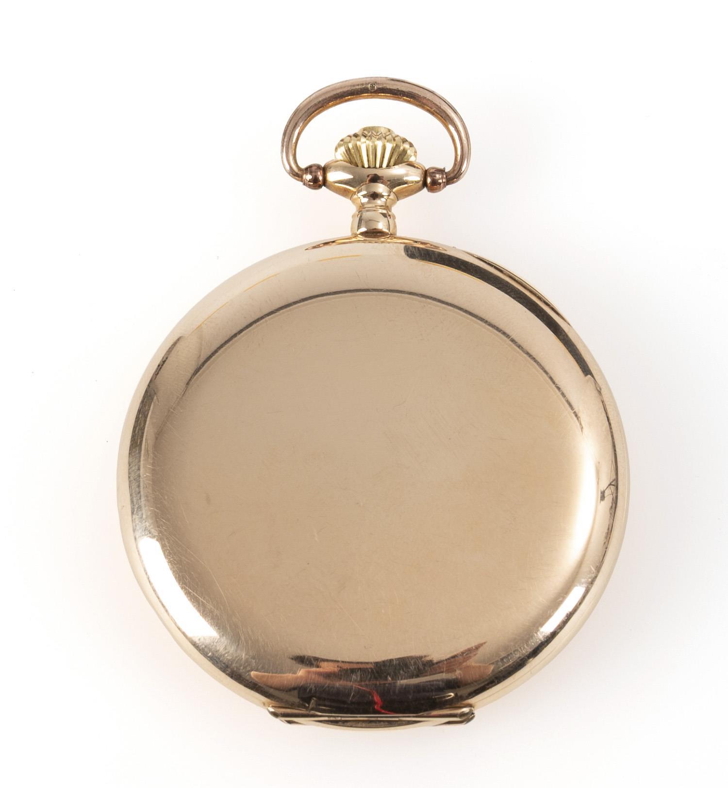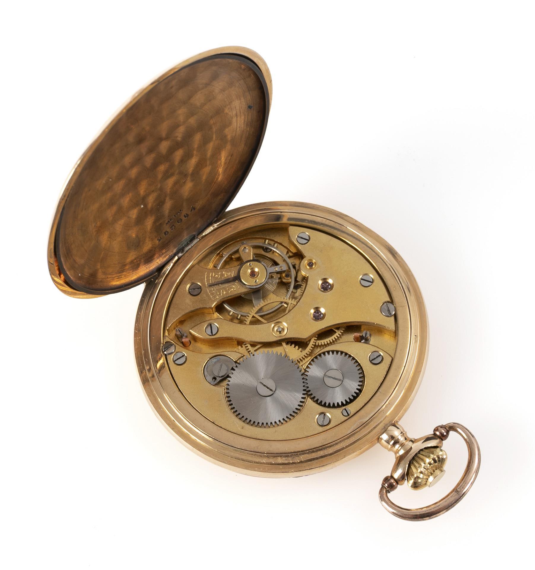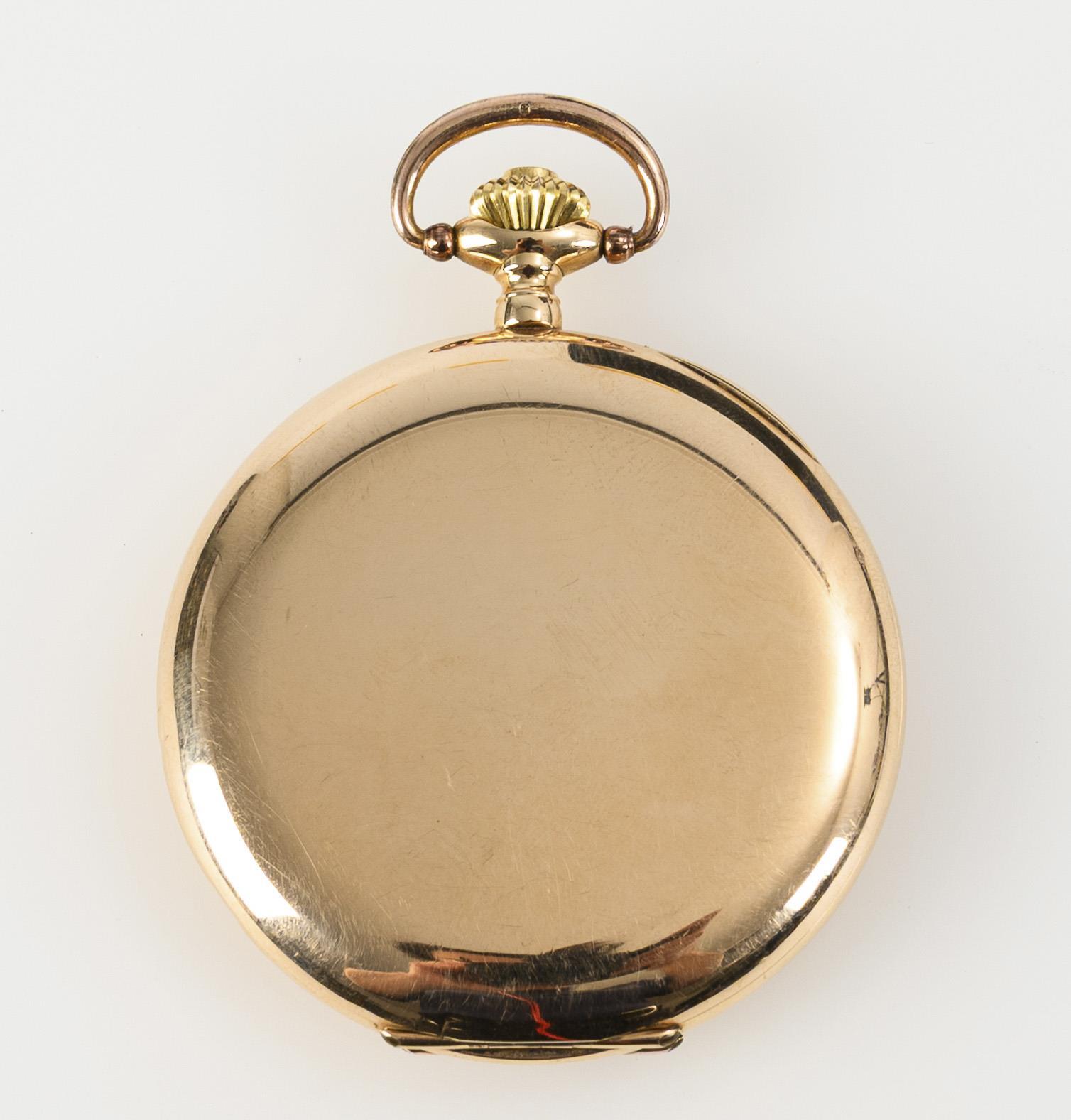 585 gepunzt, Schweizer Beschauzeichen, Feingehaltsstempel, Firmenmarke, Staubdeckel aus Metall. Ø 5,1 cm. 78 g.