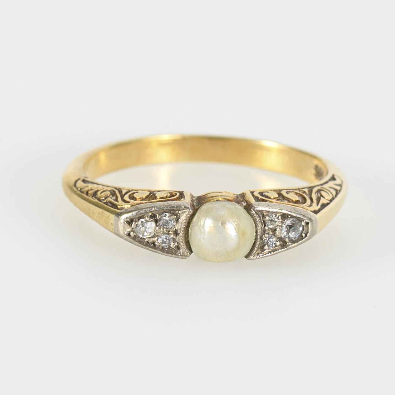 Ring mit Perle in einem ornamental ausgestalteten Ringkopf, dieser an den Ringschultern mit je 3 in Weißgold gefassten Diamanten besetzt. Leichte, altersgemäße Tragespuren am Gold und an der Perle.