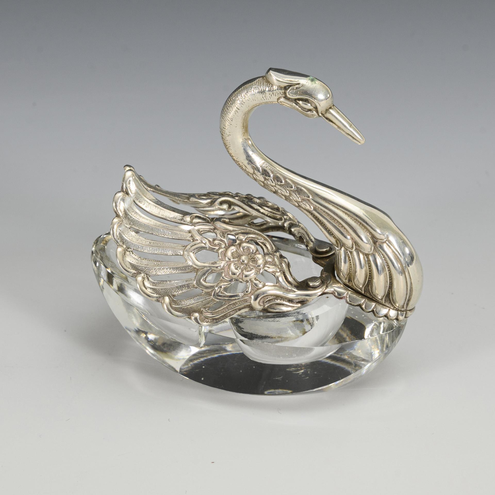 8 Silberschälchen, 1 ovales Tablett, 4 Miniatur-Löffelchen (davon nur einer Silber) und 1 Saliere in Schwanenform. Leichte Gebrauchsspuren, teils kleine Dellen.