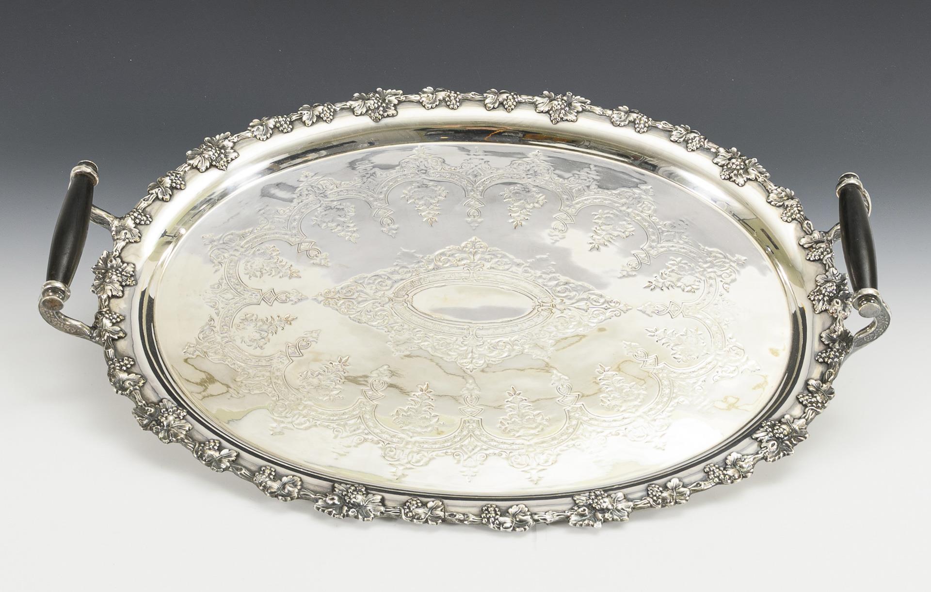 Ovales Tablett mit Ornamentgravur, Reliefrand mit Weinlaub und 2 hochgezogenen Holzgriffen.