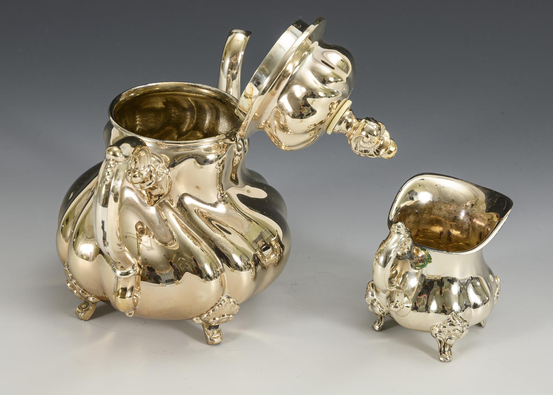 Godronierte, bauchige Form: Mokkakännchen mit Scharnierdeckel (H 16,5 cm), Milchkännchen (H 7,5 cm) und runde Zuckerschale (H 4 cm).