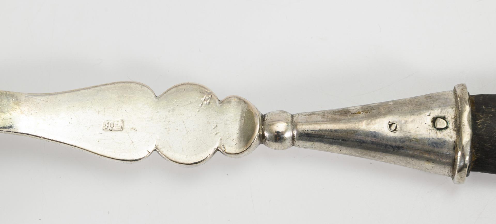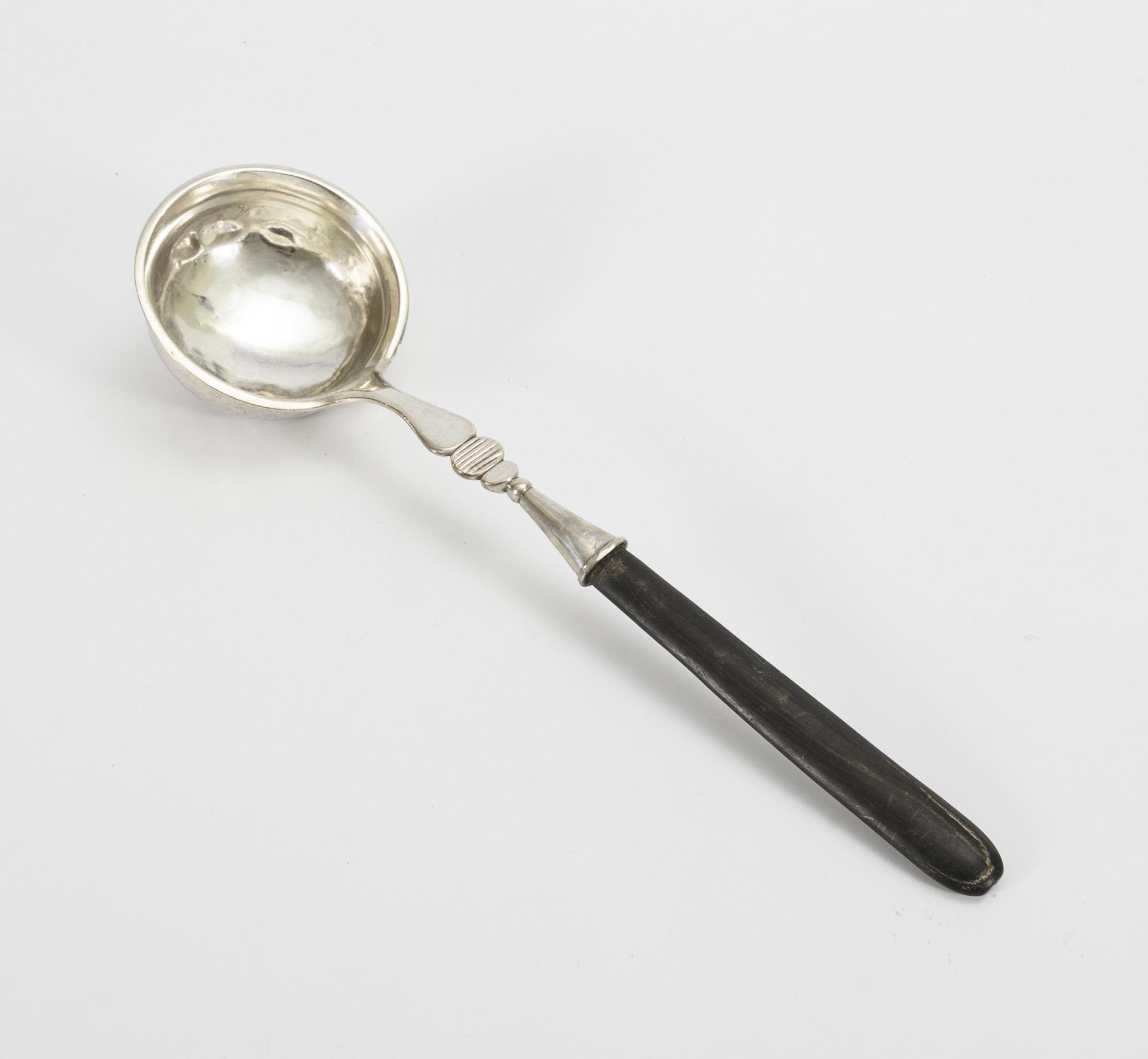 Versilberte Biedermeier-Kelle mit ebonisiertem Holzgriff (Meisterzeichen HB gepunzt, L 36 cm). / Jüngere Silberkelle (Halbmond/Krone/800 gepunzt, L 33 cm, 170 g). 1x mit Altersspuren und Dellen.
