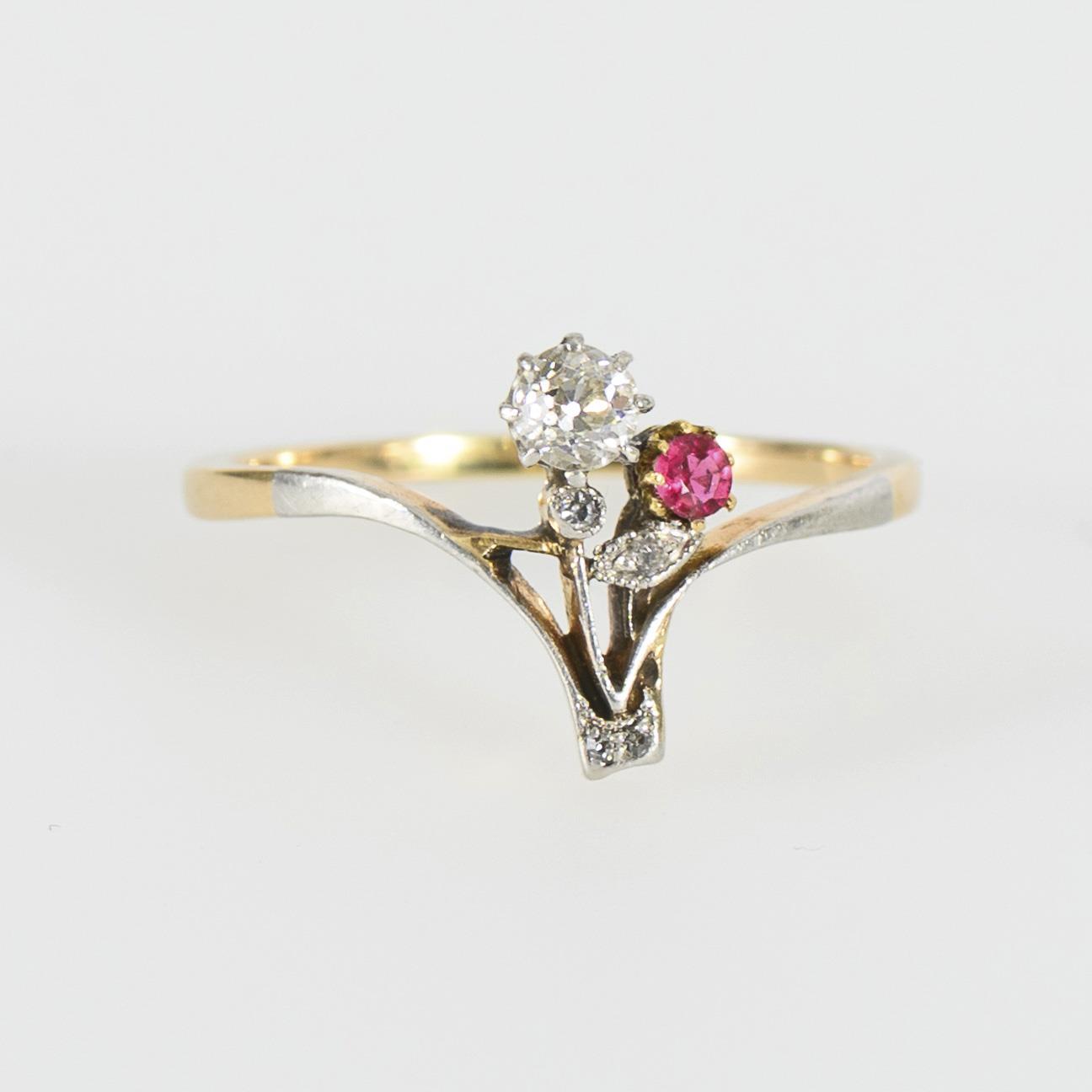 Ring aus der Zeit der Jahrhundertwende. Der Ringkopf als kleines Blumenbouquet ausgeformt und mit einem Altschliff-Brillanten sowie einem roten Schmuckstein und weiteren kleinen Diamantsplittern besetzt. Leichte, altersentsprechende Tragespuren.