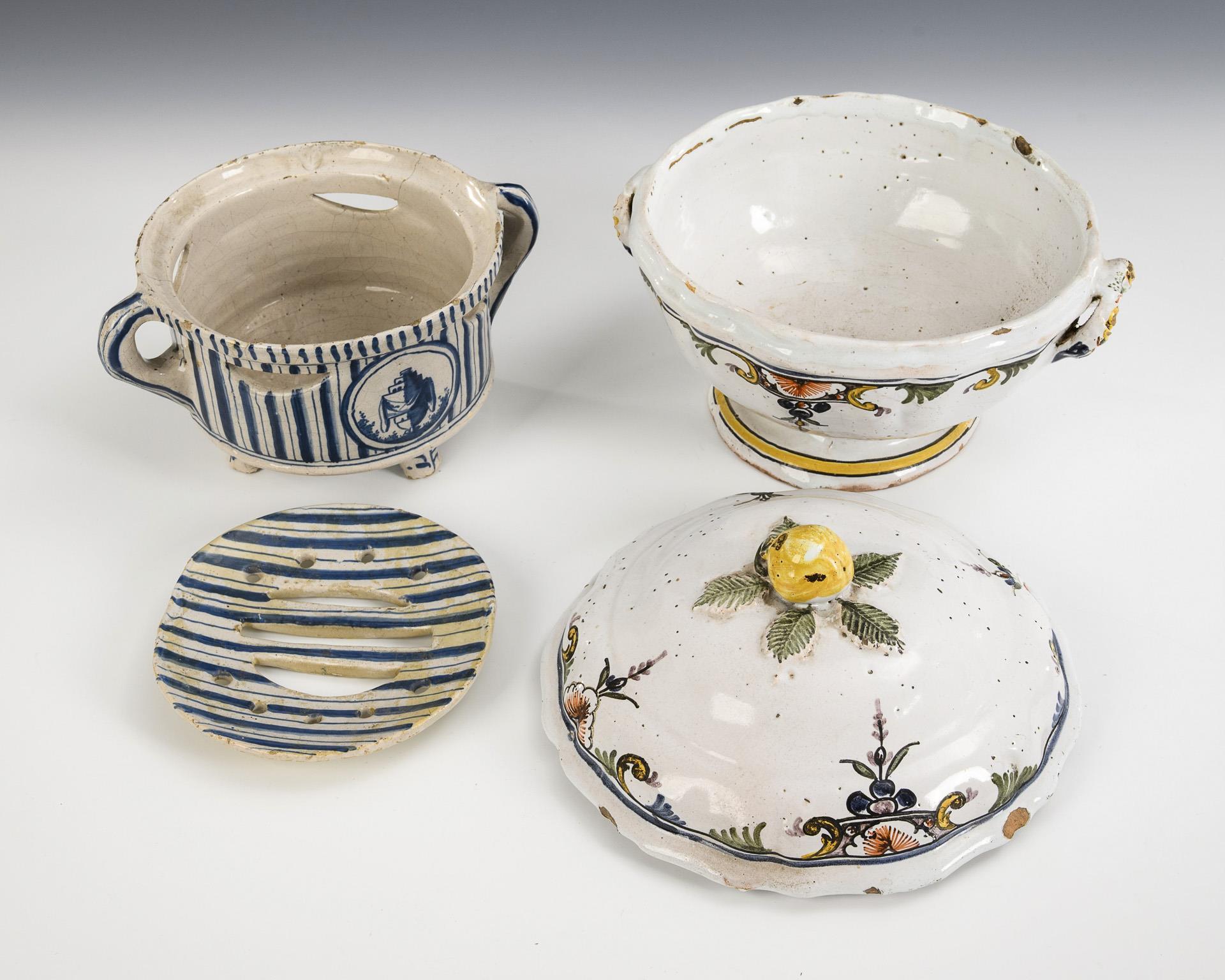 Runde Terrine mit leicht gebuckelter Wandung, seitlichen Handhaben und Rundfuß, gewölbter Deckel mit gelbem Fruchtknauf. Zylindrischer Henkeltopf auf 3 Füßen, mit durchbrochener Wandung und konkavem, durchbrochenem Einsatz, erinnert an ein Stövchen oder ein Apothekergefäß für Kräuter und Blumen. Bestoßungen, fein glasurrissig, Stövchen mit Mündungsrissen und restauriertem Einsatz.