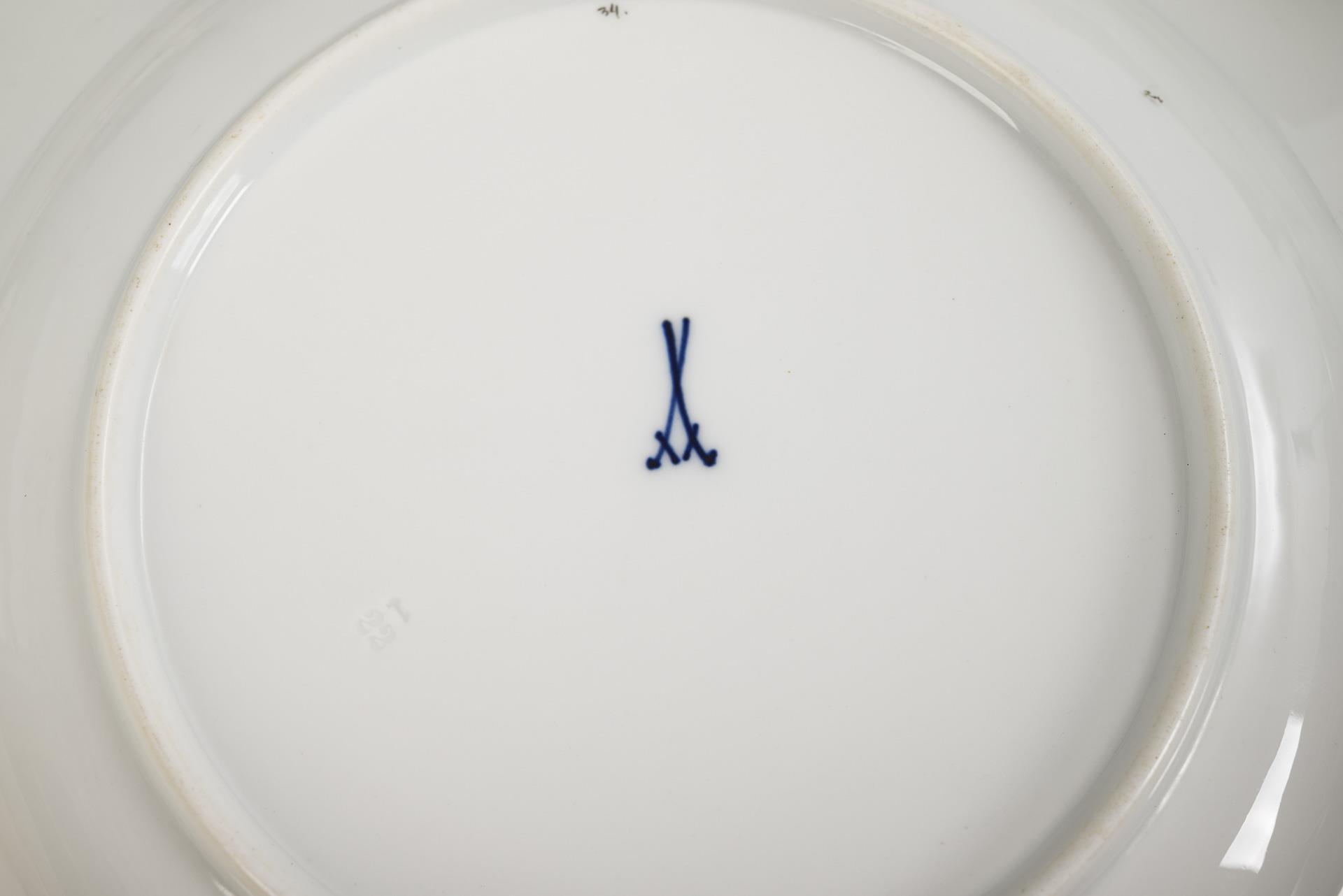 38 Teile. Form "Neuer Ausschnitt". 9 Speiseteller, 9 Suppenteller, 4 Untertassen (diese Form "Großer Ausschnitt"), 6 Messerbänkchen, 3 Ovalplatten (L 25, 34,5 und 41,5 cm), 1 runde Schale (Ø 28 cm), 1 Quadratschale (22 x 22,5 cm), 1 Schüssel (Ø 15,5 cm), 1 Sauciere (L 26,5) mit Servierlöffel (L 21 cm), 1 Deckelschüssel (H 19,5 cm) und 1 Muschelsaliere. Geklebter Abbruch an der Saliere.