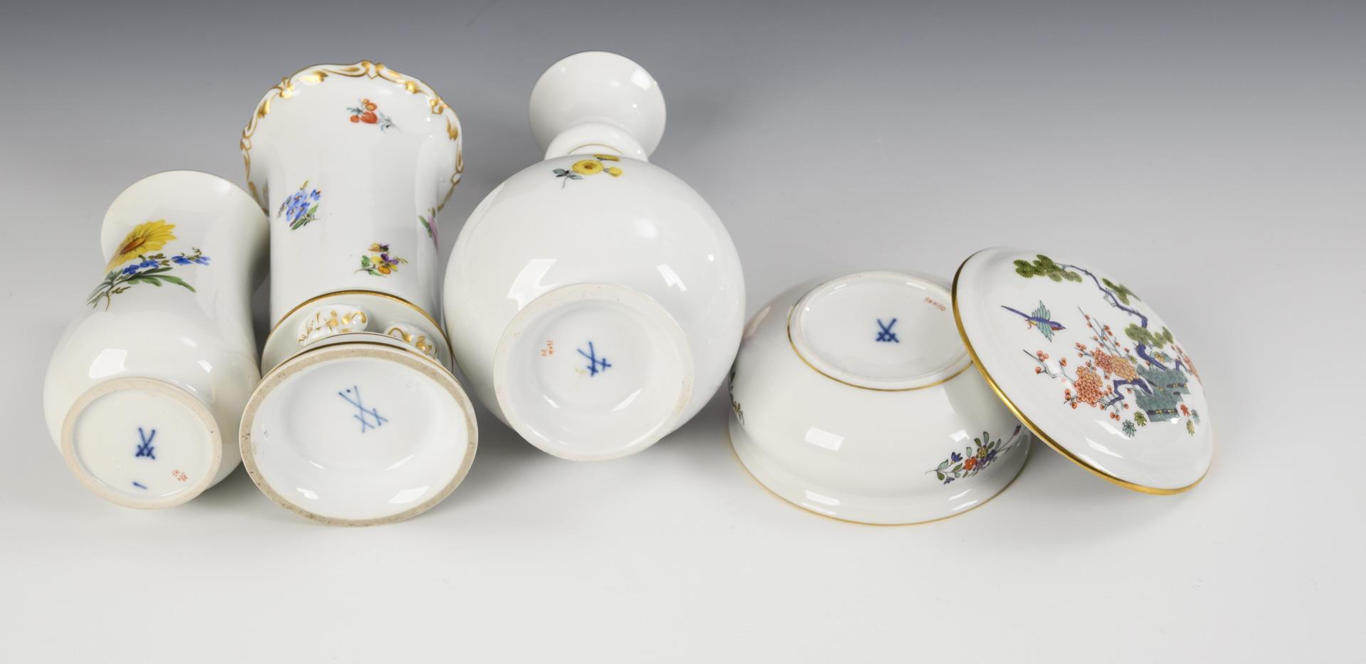 2x mit Blumenmalerei: Enghalsvase (H 18 cm) und konische Vase (H 11 cm). / 1 Sockelvase mit Streublümchenmalerei (H 14,5 cm). / 1 gedrückt gebauchte Dose mit Astmuster (Ø 9,5 cm). Kleiner Chip an 1 Vasenrand.