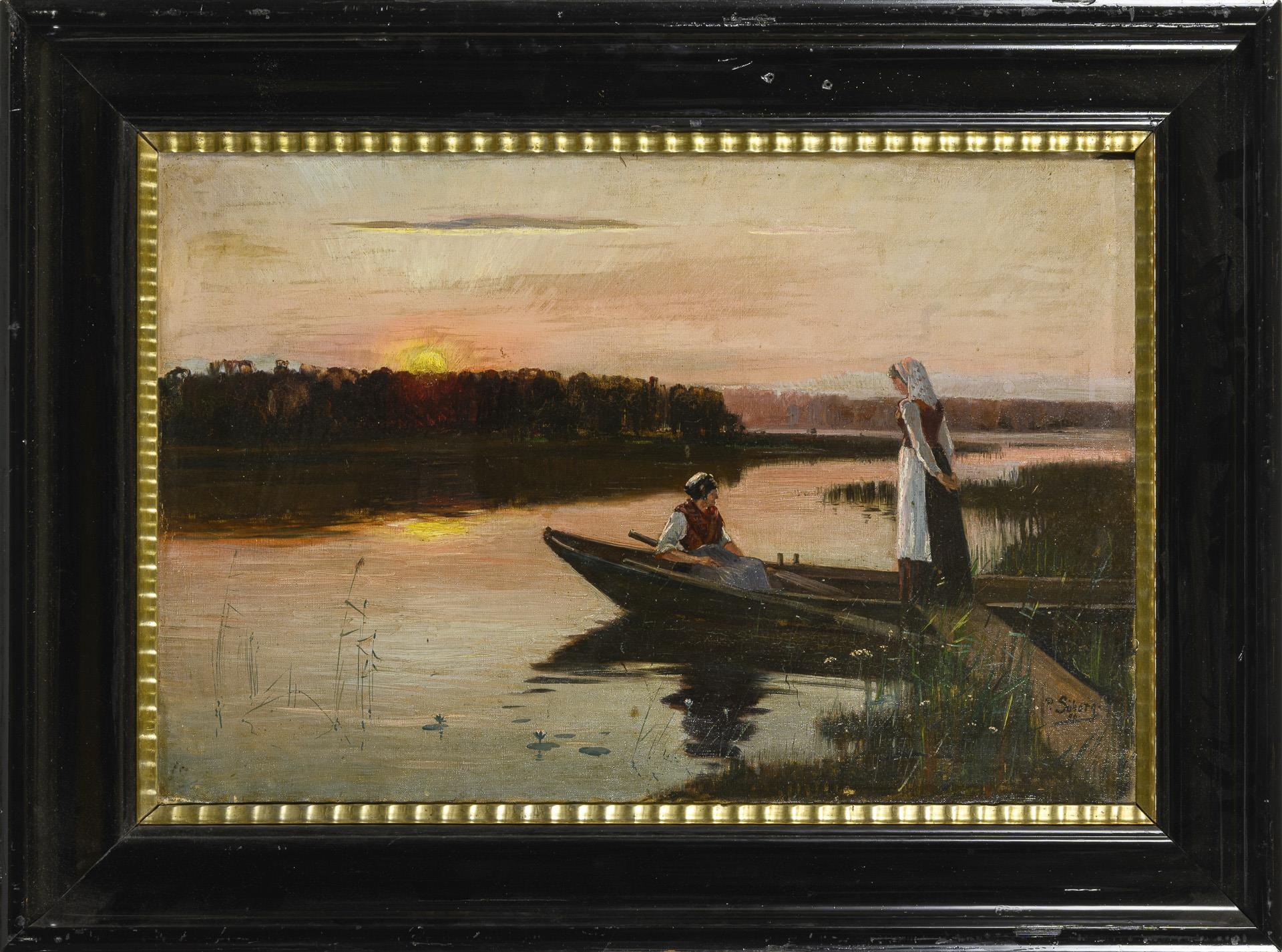 Die beiden Frauen am Steg und im Boot mit Blick über den ruhigen Fluss zur untergehenden Sonne.