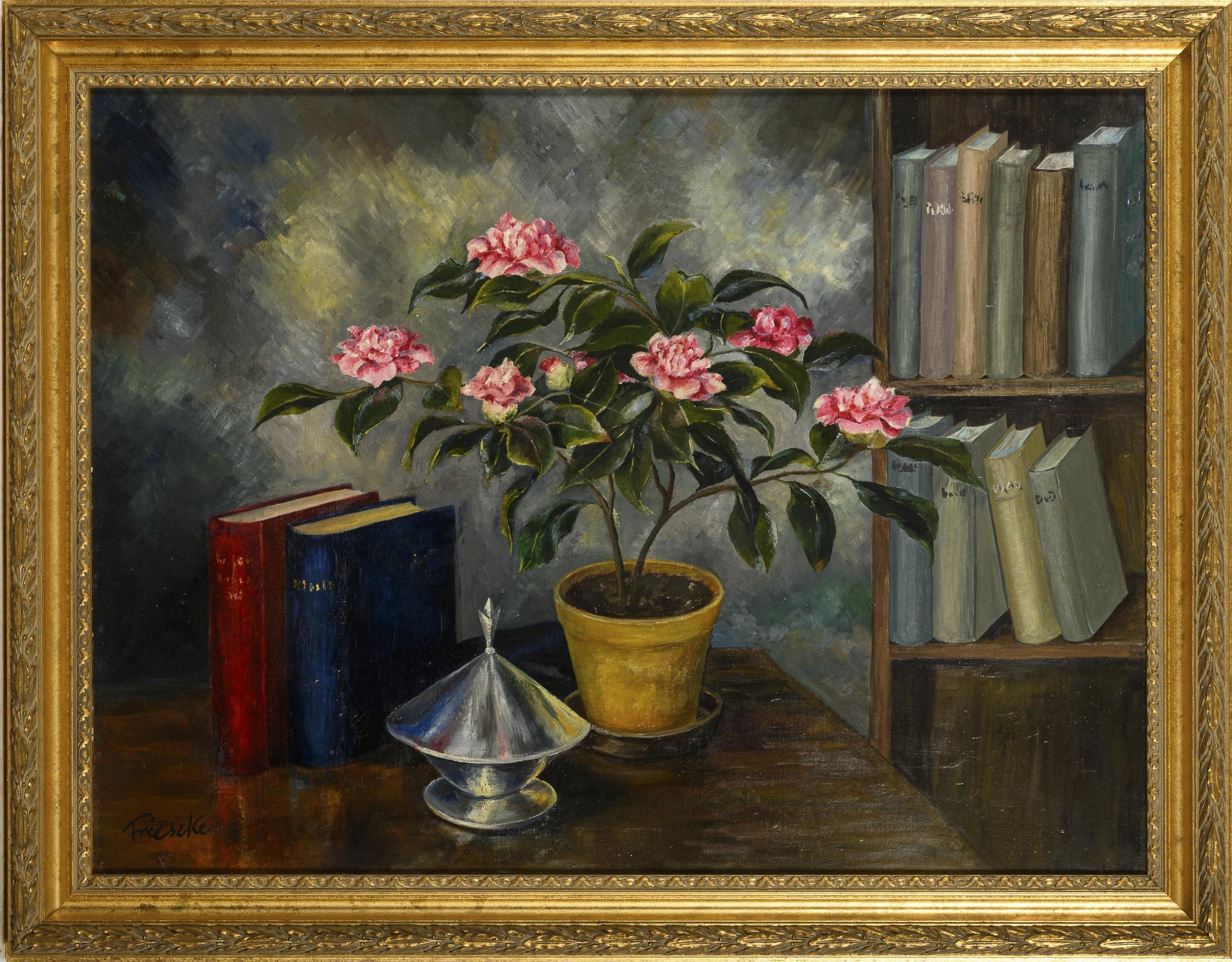 Azalee in einem Topf neben Büchern und silbernem Gefäß auf einem Tisch neben dem Bücherregal.