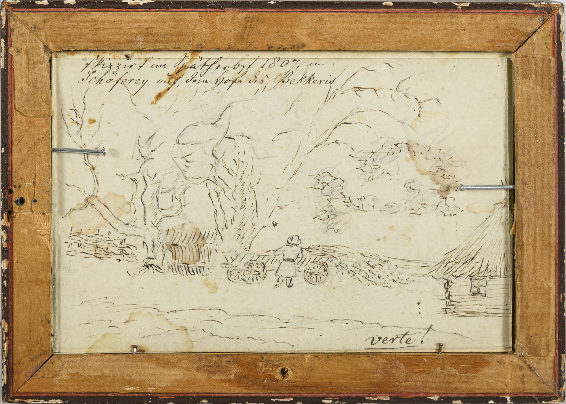 Figuren, bezeichnet "Skizziert im Schwenzelsten Kriege im Winter 1807/08". Rückseite mit der Skizze eines Bauernhofes, "Skizziert im Spätherbst 1807 in Schäferey auf dem Hofe des Bekkeris".