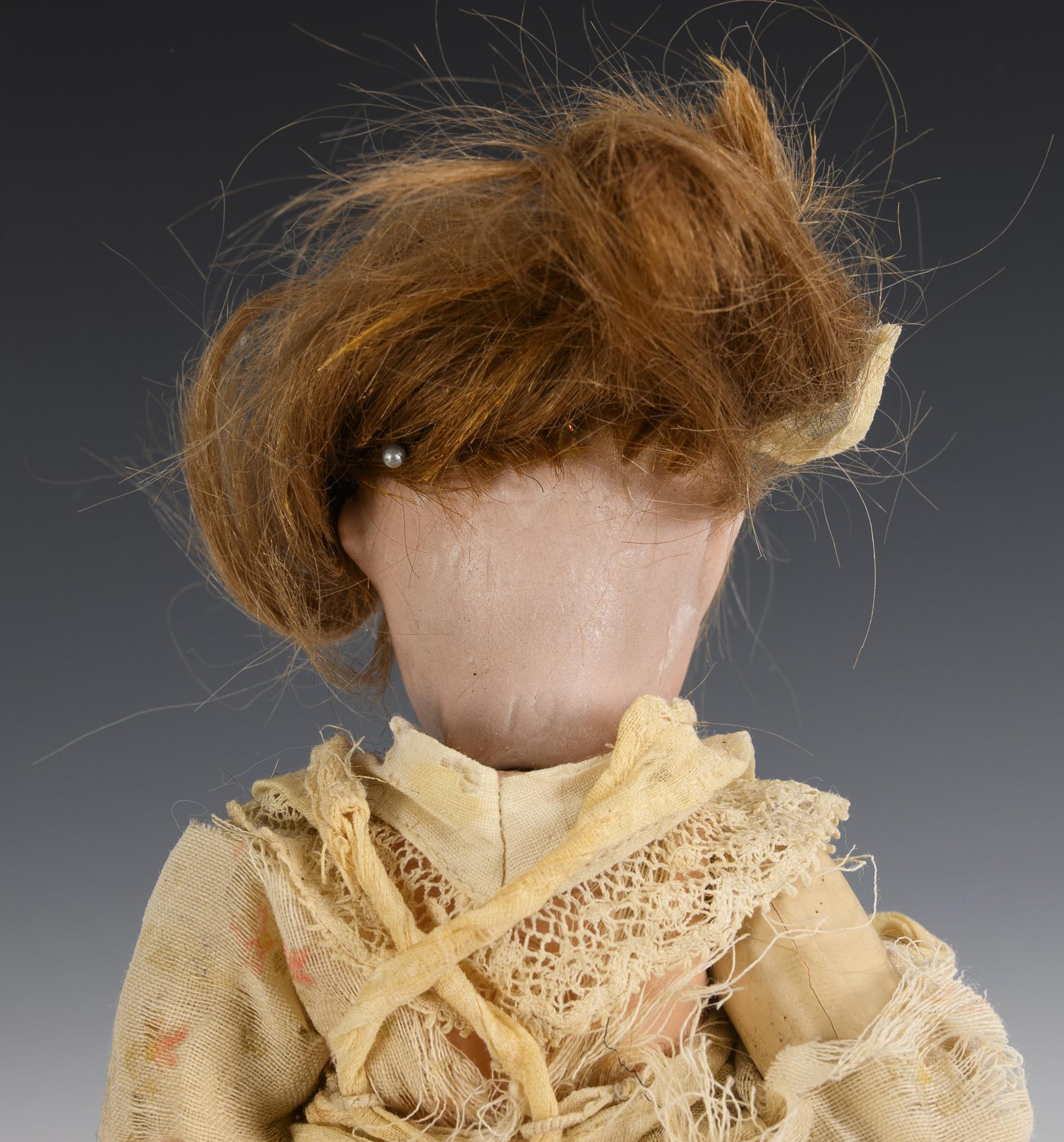 Porzellankopf-Püppchen (K & R) mit Kurbelkopf, blauen Schlafaugen, Mohairperücke, 9-teiligem Gliederkörper und hellem Kleid (L 20 cm). / Schönes Schlafzimmermöbel-Konvolut: 2 Betten, 2 Nachtschränkchen, Frisierkommode, 2 Stühle und Waschtisch aus Blech. Dazu etwas Zubehör. Teils stärkere Altersspuren, Defekte.